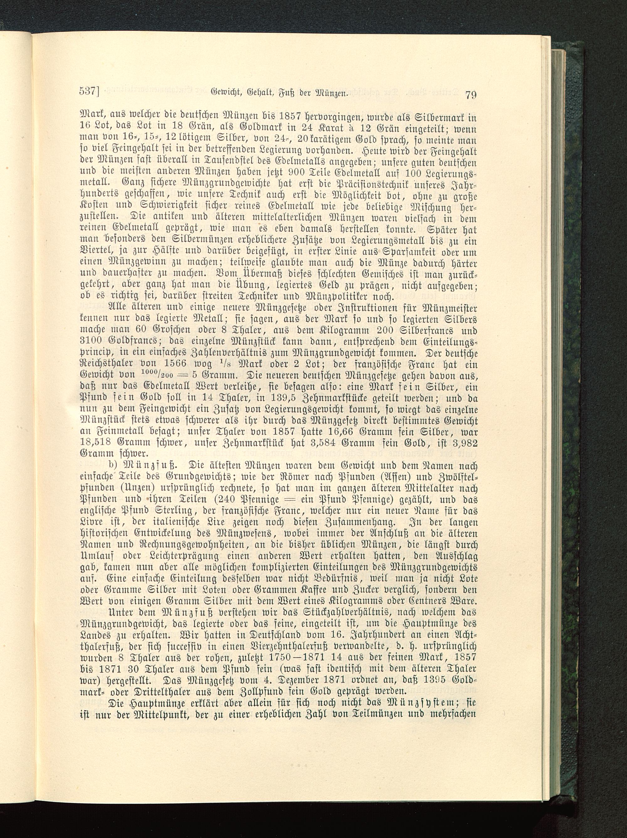 Unter dem Münzfuß verstehen wir das Stückzahlverhältnis, nach welchem dasMünzgrundgewicht, das legierte oder das feine, eingeteilt ist, um die Hauptmünze desLandes zu erhalten. Wir hatten in Deutschland vom 16. Jahrhundert an einen Acht-thalersuß, der sich successiv in einen Vierzehnthalcrsuß verwandelte, d. h. ursprünglichwurden 8 Thaler aus der rohen, zuletzt 1750-1871 14 aus der feinen Mark, 1857bis 1871 30 Thaler aus dem Psund fein (was fast identisch mit dem älteren Thaler war) hergestellt. Das Münzgesetz vom 4. Dezember 1871 ordnet an, daß 1395 Gold-mark- oder Drittelthalcr aus dem Zollpfund sein Gold geprägt werden.