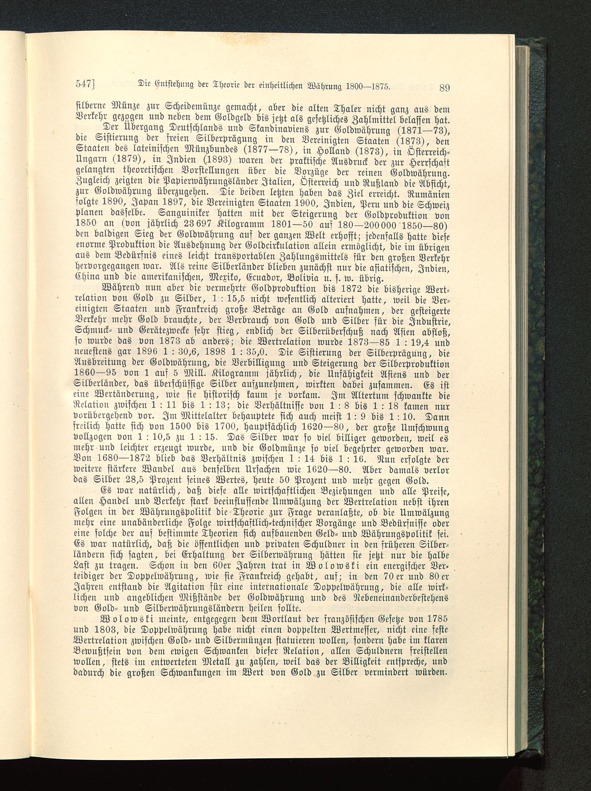 Wolowski meinte, entgegcgen dem Wortlaut der französischen Gesetze von 1785und 1803, die Doppelwährung habe nicht einen doppelten Wertmesser, nicht eine sesteWertrelation zwischen Gold- und Silbermünzen statuieren wollen, sondern habe im klarenBewußtsein von dem ewigen Schwanken dieser Relation, allen Schuldnern freistellenwollen, stets im entwerteten Metall zu zahlen, weil das der Billigkeit entspreche, unddadurch die großen Schwankungen im Wert von Gold zu Silber vermindert würden.
