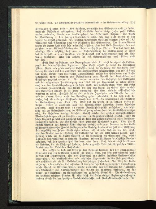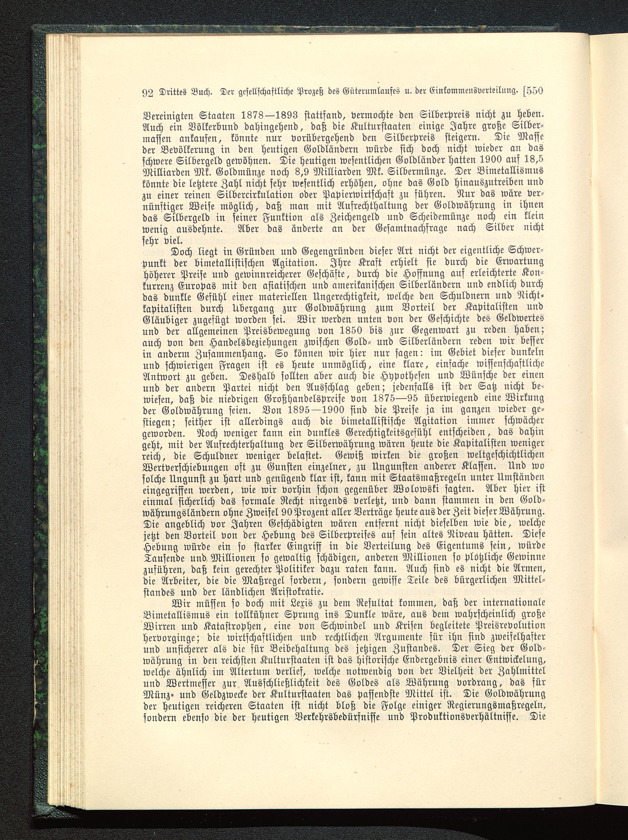 Doch liegt in Gründen und Gegengründen dieser Art nicht der eigentliche Schwer-punkt der bimetallistischen Agitation. Ihre Kraft erhielt sie durch die Erwartunghöherer Preise und gewinnreicherer Geschäfte, durch die Hoffnung auf erleichterte Kon-kurrenz Europas mit den asiatischen und amerikanischen Silberländern und endlich durchdas dunkle Gefühl einer materiellen Ungerechtigkeit, welche den Schuldnern und Nicht-kapitalisten durch Übergang zur Goldwährung zum Vorteil der Kapitalisten undGläubiger zugefügt worden sei. Wir werden unten von der Geschichte des Geldwertesund der allgemeinen Preisbewegung von 1850 bis zur Gegenwart zu reden haben;auch von den Handelsbeziehungen zwischen Gold- und Silberländern reden wir besserin anderm Zusammenhang. So können wir hier nur sagen: im Gebiet dieser dunkelnund schwierigen Fragen ist es heute unmöglich, eine klare, einfache wissenschaftlicheAntwort zu geben. Deshalb sollten aber auch die Hypothesen und Wünsche der einenund der andern Partei nicht den Ausschlag geben; jedenfalls ist der Satz nicht be-wiesen, daß die niedrigen Großhandelspreise von 1875—95 überwiegend eine Wirkungder Goldwährung seien. Von 1895—1900 sind die Preise ja im ganzen wieder ge-stiegen; seither ist allerdings auch die bimetallistische Agitation immer schwächergeworden. Noch weniger kann ein dunkles Gerechtigkeitsgefühl entscheiden, das dahingeht, mit der Aufrechterhaltung der Silberwährung wären heute die Kapitalisten wenigerreich, die Schuldner weniger belastet. Gewiß wirken die großen weltgeschichtlichenWertverschiebungen oft zu Gunsten einzelner, zu Unguusten anderer Klassen. Und wosolche Ungunst zu hart und genügend klar ist, kann mit Staatsmaßregeln unter Umständeneingegriffen werden, wie wir vorhin schon gegenüber Wolowski sagten. Aber hier isteinmal sicherlich das formale Recht nirgends verletzt, und dann stammen in den Gold-währungsländern ohne Zweifel 90 Prozent aller Verträge heute aus der Zeit dieser Währung.Die angeblich vor Jahren Geschädigten wären entfernt nicht dieselben wie die, welchejetzt den Vorteil von der Hebung des Silberpreises auf sein altes Niveau hätten. DieseHebung würde ein so starker Eingriff in die Verteilung des Eigentums sein, würdeTausende und Millionen so gewaltig schädigen, anderen Millionen so plötzliche Gewinnezuführen, daß kein gerechter Politiker dazu raten kann. Auch sind es nicht die Armen,die Arbeiter, die die Maßregel fordern, fondern gewisse Teile des bürgerlichen Mittel-standes und der ländlichen Aristokratie.