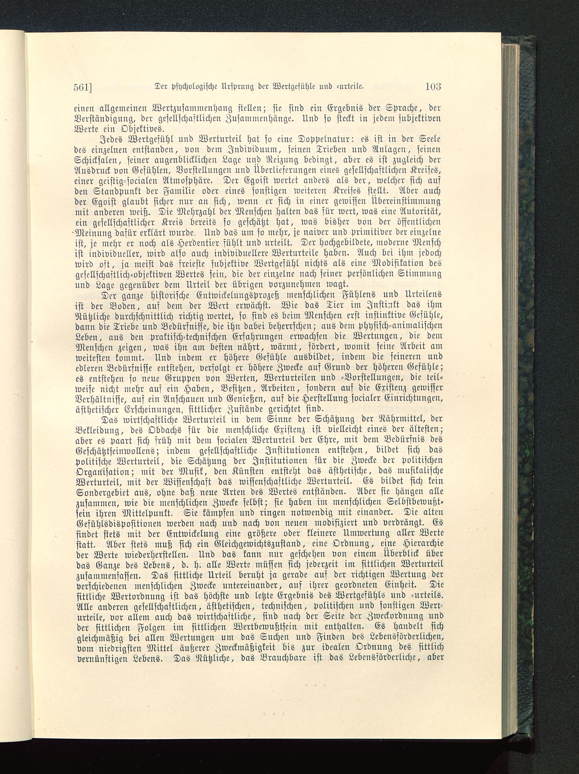 Der ganze historische Entwickelungsprozeß menschlichen Fühlens und Urteilensist der Boden, auf dem der Wert erwächst. Wie das Tier im Instinkt das ihmNützliche durchschnittlich richtig wertet, so sind es beim Menschen erst instinktive Gefühle,dann die Triebe und Bedürfnisse, die ihn dabei beherrschen; aus dem physisch-animalischenLeben, aus den praktisch-technischen Erfahrungen erwachsen die Wertungen, die demMenschen zeigen, was ihn am besten nährt, wärmt, fördert, womit seine Arbeit amweitesten kommt. Und indem er höhere Gefühle ausbildet, indem die feineren undedleren Bedürfnisse entstehen, verfolgt er höhere Zwecke auf Grund der höheren Gefühle;es entstehen so neue Gruppen von Werten, Werturteilen und -Vorstellungen, die teil-weise nicht mehr auf ein Haben, Besitzen, Arbeiten, sondern auf die Existenz gewisserVerhältnisse, auf ein Anschauen und Genießen, aus die Herstellung socialer Einrichtungen,ästhetischer Erscheinungen, sittlicher Zustände gerichtet sind.
