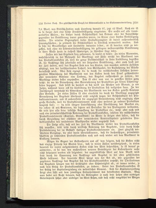 Mögen die Gegner der Kostentheorie aus all' dem folgern, daß die Kosten nichtdas einzige Princip des Wertes seien, daß in vielen Fällen vorübergehend, in vielendauernd die realen aufgewendeten Kosten nicht den Wert beherrschen, so ist darauf zuantworten, es sei von den maßvolleren neueren Verteidigern der Kostentheorie mehrnicht behauptet worden als folgendes: der augenblickliche Wert auf dem Markt wirdstets durch die Spannung von Nachfrage und Angebot in der oben geschildertenWeise bestimmt- Der dauernde Wert hängt von der Art ab, wie gegenüber dergegebenen Nachfrage das Angebot sich den Produktionskosten anpaßt; die Oscillationendes Angebots hängen von der Leichtigkeit oder Schwierigkeit ab, es immer wieder, jenach dem Ersatz der Produktionskosten, zu ändern. Unter den Produktionskosten istder Ersatz der Kapitalverzinsung ein wesentliches Element. Und die Kapitalverzinsungsteigt oder sällt mit dem jeweiligen Seltenheitswert des betreffenden Kapitals. Magman dabei mit Recht betonen, daß die Rittergüter je nach dem hohen oder niedrigenGetreidepreis höher oder niedriger im Wert stehen, und daß nicht umgekehrt der Weizen