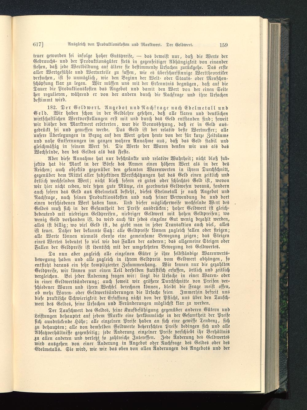 Aber diese Annahme hat nur beschränkte und relative Wahrheit; nicht bloß sub-jektiv hat die Mark in der Börse des Armen einen höhern Wert als in der desReichen; auch objektiv gegenüber den gesamten Warenwerten in ihrem Durchschnitt,gegenüber dem Mittel aller subjektiven Wertschätzungen hat das Geld einen zeitlich undörtlich wechselnden Wert; nicht bloß sofern es gutes oder schlechtes Geld ist, wovonwir hier nicht reden, wir setzen gute Münze, ein geordnetes Geldwesen voraus, sondernauch sofern das Geld aus Edelmetall besteht, dieses Edelmetall je nach Angebot undNachfrage, nach seinen Produktionskosten und nach seiner Verwendung da und dorteinen verschiedenen Wert haben kann. Und dieser möglicherweise wechselnde Wcrt desGeldes muß sich in der Gesamtheit der Preise ausdrücken; hoher Geldwert ist gleich-bedeutend mit niedrigen Geldpreisen, niedriger Geldwert mit hohen Geldpreisen; wowenig Geld vorhanden ist, da wird auch für jedes einzelne Gut wenig bezahlt werden,alles ist billig; wo viel Geld ist, da giebt man in jeder Transaktion auch viel, allesist teuer. Daher der bekannte Satz: alle Geldpreise können zugleich fallen oder steigen;alle Werte können niemals ebenso eine gemeinsame Bewegung zeigen; das Steigeneines Wertes bedeutet so viel wie das Fallen der anderen; das allgemeine Steigen oderFallen der Geldpreise ist identisch mit der umgekehrten Bewegung des Geldwertes.