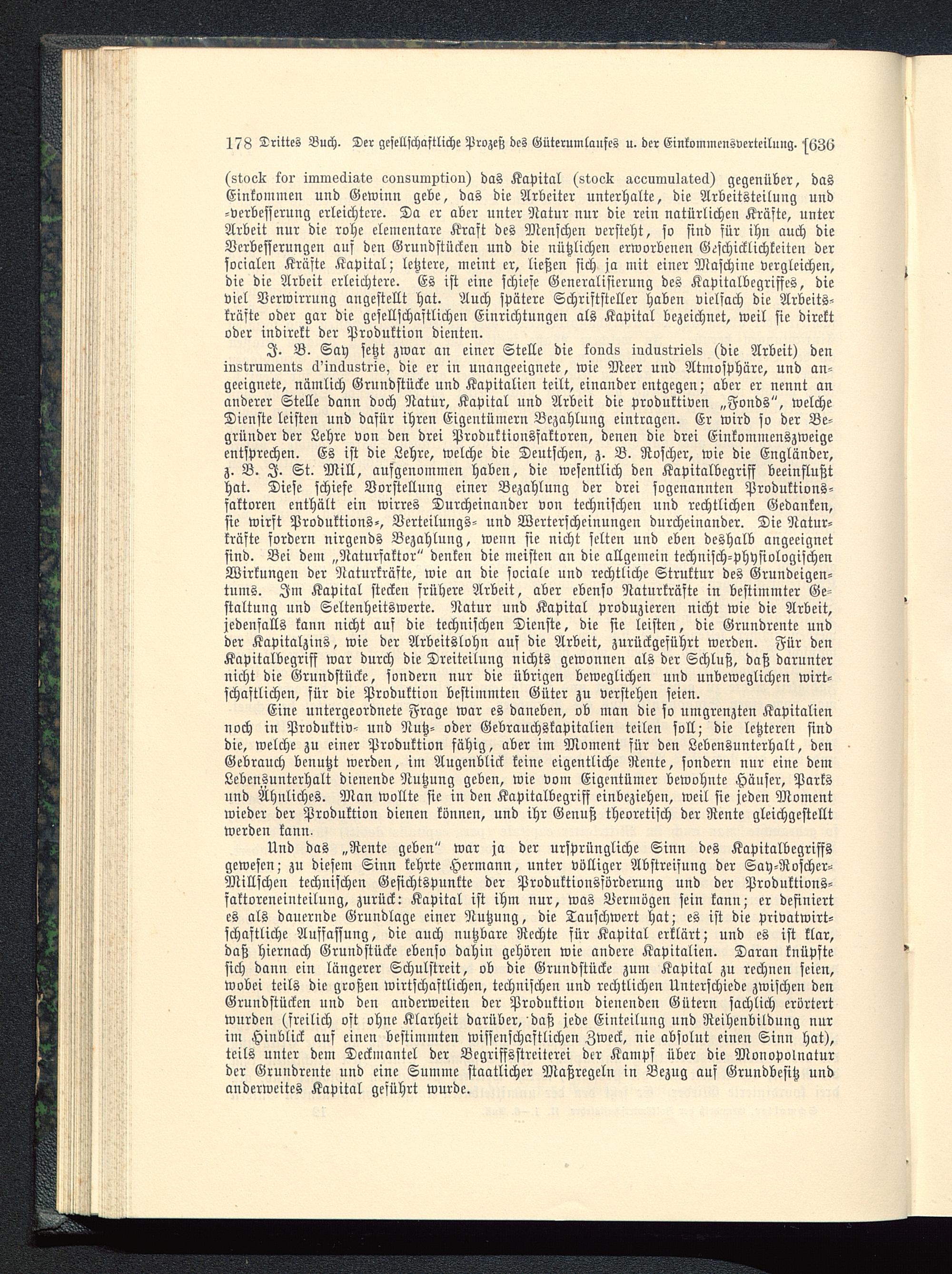 Eine untergeordnete Frage war es daneben, ob man die so umgrenzten Kapitaliennoch in Produktiv- und Nutz- oder Gebrauchskapitalien teilen soll; die letzteren sinddie, welche zu einer Produktion fähig, aber im Moment für den Lebensunterhalt, denGebrauch benutzt werden, im Augenblick keine eigentliche Rente, sondern nur eine demLebensunterhalt dienende Nutzung geben, wie vom Eigentümer bewohnte Häuser, Parksund Ähnliches. Man wollte sie in den Kapitalbegriff einbeziehen, weil sie jeden Momentwieder der Produktion dienen können, und ihr Genuß theoretisch der Rente gleichgestelltwerden kann-
