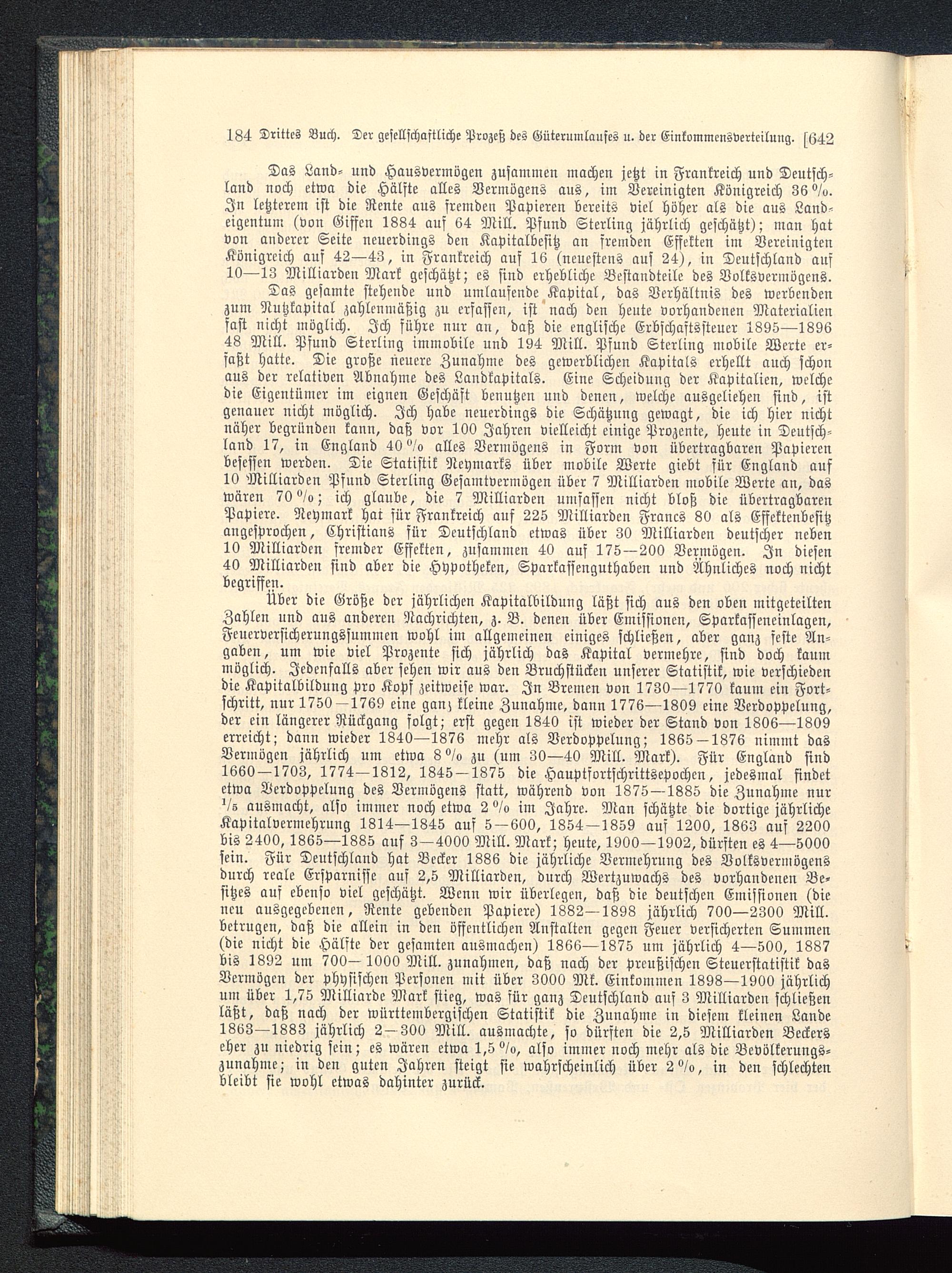 Das Land- und Hausvermögen zusammen machen jetzt in Frankreich und Deutsch-land noch etwa die Hälfte alles Vermögens aus, im Vereinigten Königreich 36°/u.In letzterem ist die Rente aus fremden Papieren bereits viel höher als die aus Land-eigentum (von Giffen 1884 auf 64 Mill. Pfund Sterling jährlich geschätzt); man hatvon anderer Seite neuerdings den Kapitalbesitz an fremden Effekten im VereinigtenKönigreich auf 42—43, in Frankreich auf 16 (neuestens aus 24), in Deutschland auf10—13 Milliarden Mark geschätzt; es sind erhebliche Bestandteile des Volksvermögens.
