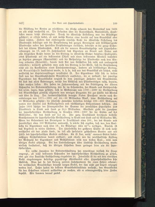 die Ablösung der Renten zu erleichtern; die Kirche erkannte den Rentenkauf von 1425an als nicht wucherisch an. Die Urkunden über die Rentenschuld, Rentenbriefe, Hand-sesten waren leicht übertragbar. Durch die öffentliche Bestellung war der Gläubigergesichert; er erfuhr dabei, ob und welche Renten etwa bereits auf dem Grundstück oderHaus ruhten. Indem das eindringende römische Recht die öffentliche Bestellung desPfandrechts beseitigte und die Verpfändung des ganzen Vermögens und stillschweigendePfandrechte neben den speciellen Verpfändungen einführte, bedrohte es die ganze Sicher-heit des älteren Pfandrechtes. Erst als die neueren Grundbuchgesetze und Hypotheken-ordnungen im 18. und 19. Jahrhundert das Eigentum an Grund und Boden undalle dinglichen Rechte daran an den Eintrag in öffentliche Bücher knüpften (Publizität),jedes Pfandrecht auf ein bestimmtes Objekt und einen bestimmten Wertteil desselbenzu beziehen zwangen (Specialität) und die Reihenfolge der Pfandrechte nach dem Ein-trag ordneten (Priorität), konnte diese Art von Geschäften sich rasch und umfangreichentwickeln; teilweise gestattete man auch den Vertrag in der Weise, daß die Verpfändungnicht als ein Accessorium eines Darlchensvertrags, sondern als selbständiger Vertrag,als Grund schuld konstituiert wurde, d. h. so, daß nur das Grundstück als solches, nichtpersönlich der Kapitalempfänger verpflichtet ist. Der Eigentümer läßt sich in diesemFall von der Grundbuchbehörde Grundbriefe ausstellen, die er verkauft; der jeweiligeEigentümer des Grundstückes verzinst sie dem jeweiligen Inhaber des Grundbrieses.Es sind das alles Änderungen, welche den Abschluß von Pfandverträgcn rasch, bequem,sicher machen sollen. Sie haben im Zusammenhang mit der Beseitigung der älterenSchranken der Bodenverpfändung, wie sie im Lehnswesen, der Grund- und Gutsherrlich-keit u.s.w. lageu, dazu geführt, daß in Westeuropa von 1700—1900 die Verschuldungdes Grundbesitzes ziemlich allgemein von wenigen Prozenten bis zur Hälfte des Wertesund über sie stieg. Der landwirtschaftlich benutzte Boden Preußens wurde nach Er-mittelungen von 1871—1881 auf 24—30 Milliarden Mark, seine Verschuldung auf10 Milliarden geschätzt; die jährliche Zunahme derselben beträgt 100-300 Millionen,wovon vier Fünftel aus Restkaufgcldern und rückständigen Erbportionen bestehen. ImJahre 1893 schätzte der Finanzminister die Summe der preußischen Hypotheken undPfandbriefe in Stadt und Land zu 16,5 Milliarden. Eberstadt giebt die Zunahmeder hypothekarischen Verschuldung in Preußen 1886—1897 sür die Städte auf 8,5Milliarden, für das Land auf 2,4 an. Für ganz Deutschland berechnete derselbeGewährsmann die hypothekarische Verschuldung in Stadt und Land auf-42 Milliarden Mk.Wenn der Gesamtwert des Vermögens in Deutschland etwa 200, der des Grund- undHausbcsitzcs etwa 100 Milliarden ausmacht, so würde sich ergeben, daß von, dem Real-besitz die Eigentümer noch über 58, die Gläubiger über 42°/» verfügen. Ähnlich istdas Ergebnis in vielen Ländern. Der Hüuserbesitz der größeren Städte ist noch mehrverschuldet als das platte Land, da sast alle spekulativ geschaffenen Bauten nur mitHülfe des hypothekarifchen Kredits entstehen. Es ist klar, welch' enormes Gebiet kredit-mäßigen Geschäftslebens damit entstand; und ebenso wie die wirtschaftliche Existenzder Mehrzahl der Eigentümer und Geschäftsleute teils von diesem Real-, teils vomübrigen Kredit abhängt. Bei den Untersuchungen über ländliche Verschuldung wurdevielfach konstatiert, daß die übrigen Schulden kaum geringer seien als die hypo-thekarischen.