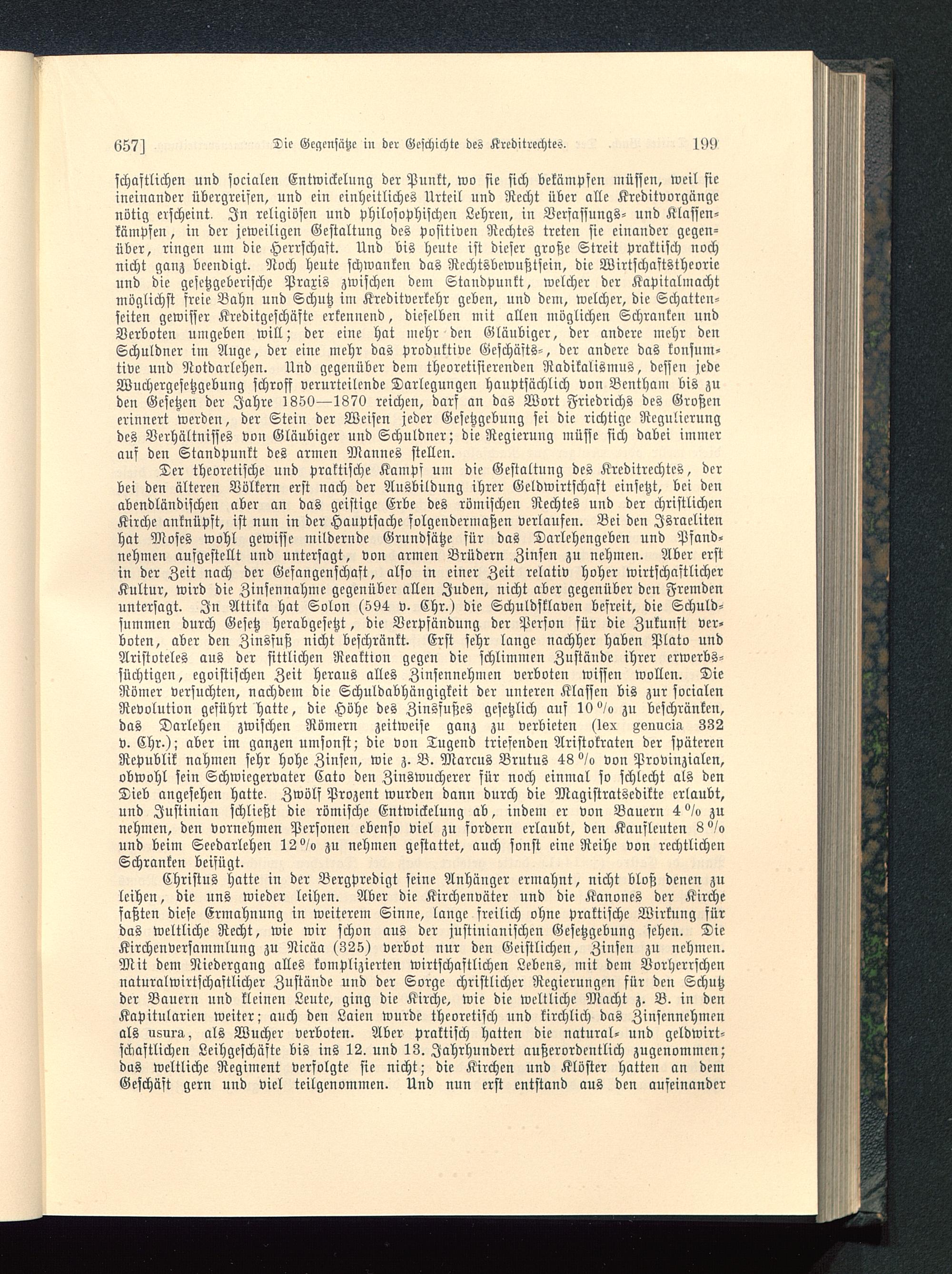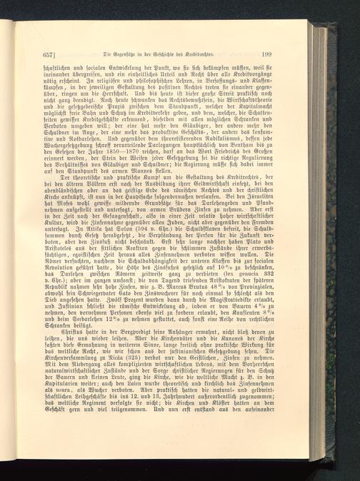 Der theoretische und praktische Kampf um die Gestaltung des Kreditrechtcs, derbei den älteren Völkern erst nach der Ausbildung ihrer Geldwirtschaft einfetzt, bei denabendländischen aber an das geistige Erbe des römischen Rechtes und der christlichenKirche anknüpft, ist nun in der Hauptsache folgendermaßen verlaufen. Bei den Jsraelitenhat Moses Wohl gewisse mildernde Grundsätze für das Darlehengeben und Pfand-nehmen aufgestellt und untersagt, von armen Brüdern Zinsen zu nehmen. Aber erstin der Zeit nach der Gefangenschaft, also in einer Zeit relativ hoher wirtschaftlicherKultur, wird die Zinsennahme gegenüber allen Juden, nicht aber gegenüber den Fremdenuntersagt. In Attika hat Solon (594 v- Chr.) die Schuldfklaven befreit, die Schuld-summen durch Gesetz herabgesetzt, die Verpfändung der Person für die Zukunft ver-boten, aber den Zinsfuß nicht beschränkt- Erst sehr lange nachher haben Plato undAristoteles aus der sittlichen Reaktion gegen die schlimmen Zustände ihrer crwerbs-füchtigen, egoistischen Zeit heraus alles Zinsennehmen verboten wissen wollen. DieRömer versuchten, nachdem die Schuldabhängigkeit der unteren Klassen bis zur socialenRevolution geführt hatte, die Höhe des Zinsfußes gesetzlich auf 1V "/o zu befchränken,das Darlehen zwischen Römern zeitweife ganz zu verbieten (lex Zsnuoig. 332v. Chr.); aber im ganzen umsonst; die von Tugend triefenden Aristokraten der späterenRepublik nahmen fehr hohe Zinsen, wie z. B. Marcus Brutus 48 °/o von Provinzialen,obwohl sein Schwiegervater Cato den Zinswucherer für noch einmal fo schlecht als denDieb angesehen hatte. Zwölf Prozent wurden dann durch die Magistratsedikte erlaubt,und Justinian schließt die römische Entwickelung ab, indem er von Bauern 4°/o zunehmen, den vornehmen Personen ebenso viel zu fordern erlaubt, den Kaufleuten 8°/ound beim Seedarlehen 12°/o zu nehmen gestattet, auch sonst eine Reihe von rechtlichenSchranken beifügt.