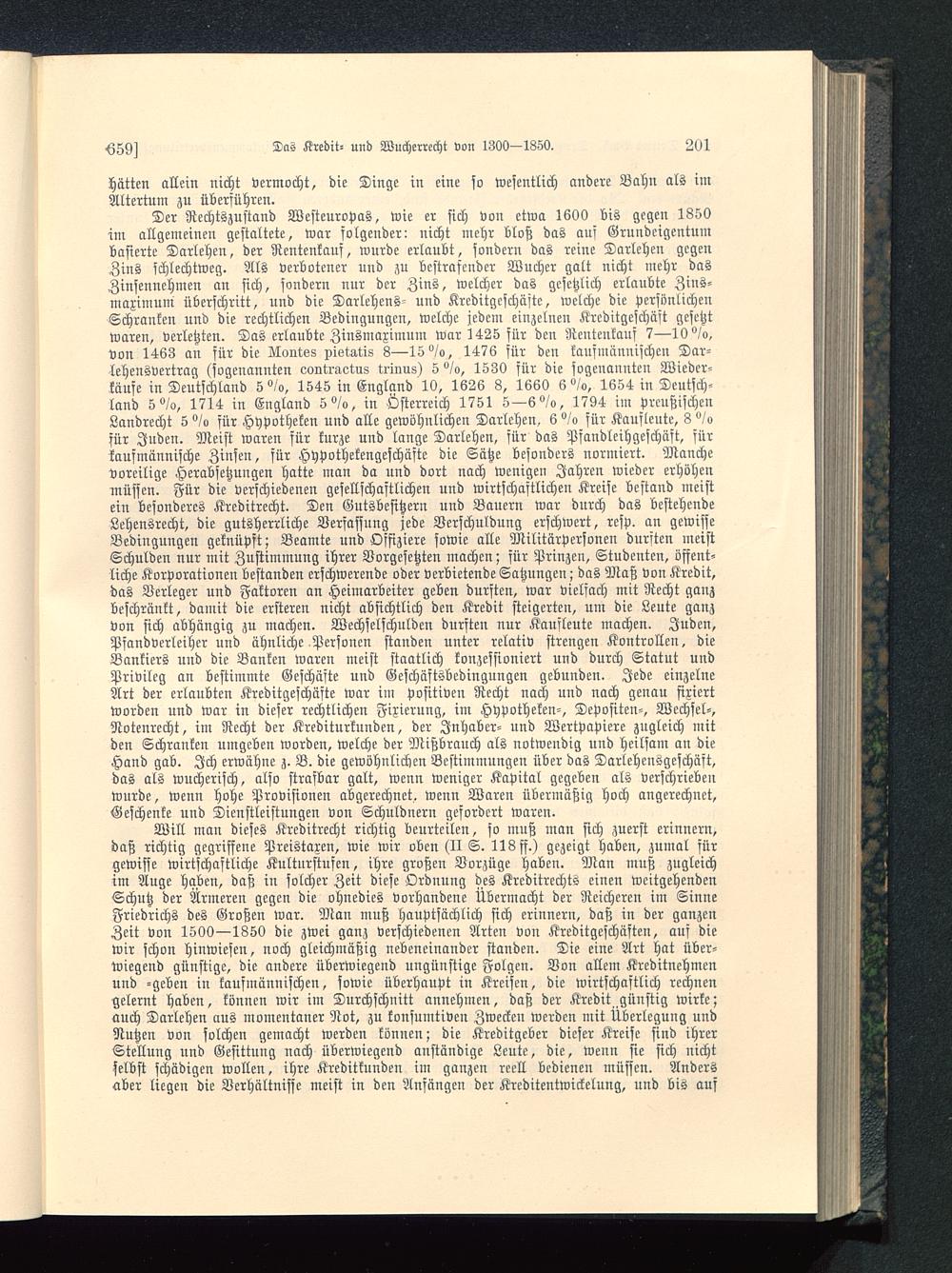Der Rechtszustaud Westeuropas , wie er sich von etwa 1600 bis gegen 1850im allgemeinen gestaltete, war folgender: nicht mehr bloß das aus Grundeigentumbasierte Darlehen, der Rentenkaus, wurde erlaubt, sondern das reine Darlehen gegenZins schlechtweg. Als verbotener und zu bestrafender Wucher galt nicht mehr dasZinsennchmen an sich, sondern nur der Zins, welcher das gesetzlich erlaubte Zins-maximum überschritt, und die Darlehens- und Kreditgeschäfte, welche die persönlichenSchranken und die rechtlichen Bedingungen, welche jedem einzelnen Kreditgeschäft gesetztwaren, verletzten. Das erlaubte Zinsmaximum war 1425 sür den Rentenkaus 7—10°/o,von 1463 an sür die Nantes xisratis 8—15°/o, 1476 für den kaufmännifchen Dar-lehensvertrag (sogenannten eontraetns trinus) 5 °/o, 1530 für die fogenannten Wieder-käufe in Deutschland 5 °/o, 1545 in England 10, 1626 8, 1660 6°/o, 1654 in Deutsch-land 5 °/o, 1714 in England 5°/o, in Österreich 1751 5—6°/o, 1794 im preußischenLandrecht 5 °/o für Hypotheken und alle gewöhnlichen Darlehen, 6°/o für Kaufleute, 8°/osür Juden. Meist waren sür kurze und lange Darlehen, sür das Pfandleihgeschäft, fürkaufmännische Zinsen, sür Hypothekengeschäste die Sätze besonders normiert. Manchevoreilige Herabsetzungen hatte man da und dort nach wenigen Jahren wieder erhöhenmüssen. Für die verschiedenen gesellschaftlichen und wirtschaftlichen Kreise bestand meistein besonderes Kreditrecht. Den Gutsbesitzern und Bauern war durch das bestehendeLehensrecht, die gutsherrliche Verfassung jede Verschuldung erschwert, resp, an gewisseBedingungen geknüpft; Beamte und Offiziere sowie alle Militärpersonen durften meistSchulden nur mit Zustimmung ihrer Vorgesetzten machen; sür Prinzen, Studenten, öffent-liche Korporationen bestanden erschwerende oder verbietende Satzungen; das Maß von Kredit,das Verleger und Faktoren an Heimarbeiter geben durften, war vielfach mit Recht ganzbeschränkt, damit die ersteren nicht absichtlich den Kredit steigerten, um die Leute ganzvon sich abhängig zu machen. Wechselschulden durften nur Kaufleute machen. Juden,Pfandverleiher und ähnliche Personen standen unter relativ strengen Kontrollen, dieBankiers und die Banken waren nieist staatlich konzessioniert und durch Statut undPrivileg an bestimmte Geschäfte und Geschäftsbedingungen gebunden. Jede einzelneArt der erlaubten Kreditgeschäste war im positiven Recht nach und nach genau fixiertworden und war in dieser rechtlichen Fixierung, im Hypotheken-, Depositen-, Wechsel-,Notenrecht, im Recht der Krediturkunden, der Inhaber- und Wertpapiere zugleich mitden Schranken umgeben worden, welche der Mißbrauch als notwendig und heilsam an dieHand gab. Ich erwähne z. B. die gewöhnlichen Bestimmungen über das Darlehensgeschäft,das als wucherisch, also strafbar galt, wenn weniger Kapital gegeben als verschriebenwurde, wenn hohe Provisionen abgerechnet, wenn Waren übermäßig hoch angerechnet,Geschenke und Dienstleistungen von Schuldnern gefordert waren.