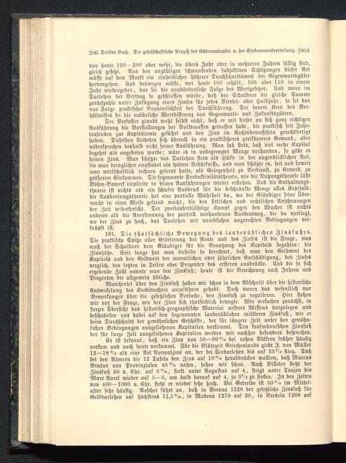 Von heute 120 — 200 oder mehr, die übers Jahr oder in mehreren Jahren fällig sind,gleich gesetzt. Ans den unzähligen schwankenden subjektiven Schätzungen dieser Artmüsse auf dem Markt ein einheitlicher höherer Durchschnittswert der Gegenwartsgüterhervorgehen, lind deswegen müsse, wer heute 100 erhält, 105 oder 110 in einemJahr wiedergeben, das sei die unabänderliche Folge des Wertgesetzes. Und wenn imDarlehen der Vertrag so geschlossen würde, daß der Schuldner die gleiche Summezurückzahle unter Zufügung eines Zinses für jedes Viertel- oder Halbjahr, so sei dasnur Folge praktischer Bequemlichkeit der Durchführung. Der innere Kern des Ver-hältnisses sei die natürliche Wertdisserenz von Gegenwarts- und Zukunftsgütern.