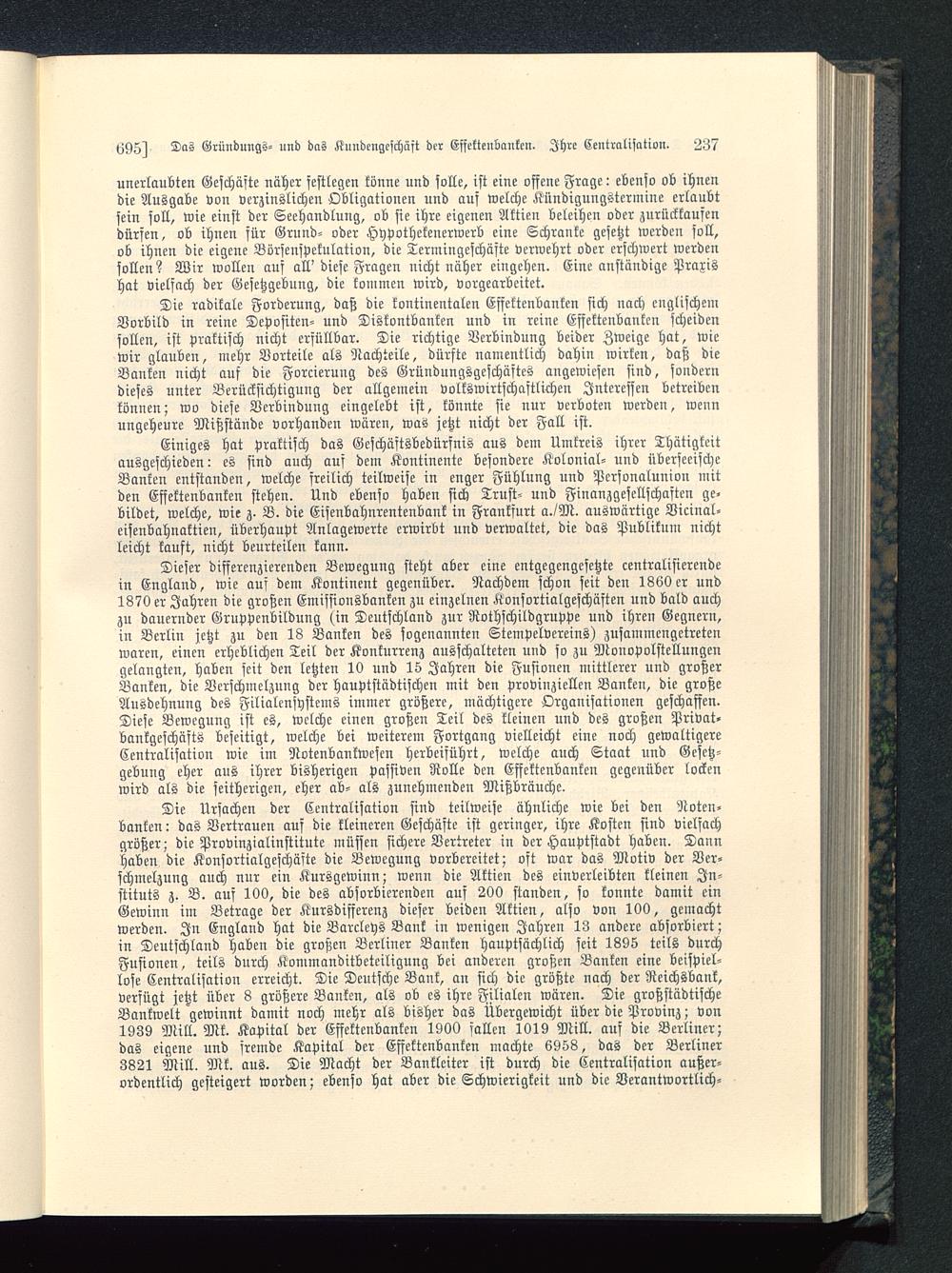 Die Ursachen der Centralisation sind teilweise ähnliche wie bei den Noten-banken : das Vertrauen aus die kleineren Geschäfte ist geringer, ihre Kosten sind vielfachgrößer; die Provinzialinstitute müssen sichere Vertreter in der Hauptstadt haben. Dannhaben die Konsortialgeschäfte die Bewegung vorbereitet; oft war das Motiv der Ver-schmelzung auch nur ein Kursgewinn; wenn die Aktien des einverleibten kleinen In-stituts z. B. auf 100, die des absorbierenden auf 200 standen, so konnte damit einGewinn im Betrage der Kursdifferenz diefer beiden Aktien, also von 100, gemachtwerden. In England hat die Barclcys Bank in wenigen Jahren 13 andere absorbiert;in Deutschland haben die großen Berliner Banken hauptsächlich seit 1895 teils durchFusionen, teils durch Kommanditbeteiligung bei anderen großen Banken eine beispiel-lose Centralisation erreicht. Die Deutsche Bank, an sich die größte nach der Reichsbank,verfügt jetzt über 8 größere Banken, als ob es ihre Filialen wären. Die großstädtischeBankwelt gewinnt damit noch mehr als bisher das Übergewicht über die Provinz; von1939 Mill. Mk. Kapital der Effektenbanken 1900 fallen 1019 Mill. auf die Berliner;das eigene und fremde Kapital der Effektenbanken machte 6958, das der Berliner3821 Mill. Mk. aus. Die Macht der Banklciter ist durch die Centralisation außer-ordentlich gesteigert worden; ebenso hat aber die Schwierigkeit und die Verantwortlich-