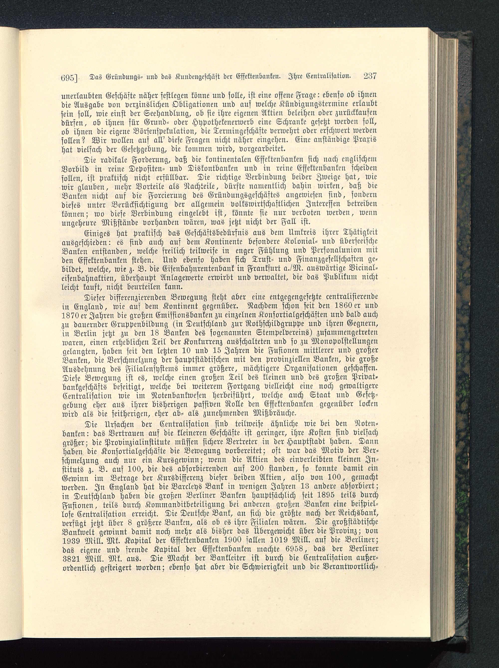 Dieser differenzierenden Bewegung steht aber eine entgegengesetzte centralisierendein England , wie auf dem Kontinent gegenüber. Nachdem schon seit den 1860 er und1870 er Jahren die großen Emissionsbanken zu einzelnen Konsortialgeschäften und bald auchzu dauernder Gruppenbildung (in Deutschland zur Rothschildgruppe und ihren Gegnern,in Berlin jetzt zu den 18 Banken des sogenannten Stempelvereins) zusammengetretenwaren, einen erheblichen Teil der Konkurrenz ausschalteten und so zu Monopolstellungengelangten, haben seit den letzten 10 und 15 Jahren die Fusionen mittlerer und großerBanken, die Verschmelzung der hauptstädtischen mit den provinziellen Banken, die großeAusdehnung des Filialensystems immer größere, mächtigere Organisationen geschaffen.Diese Bewegung ist es, welche einen großen Teil des kleinen und des großen Privat-bankgeschästs beseitigt, welche bei weiterem Fortgang vielleicht eine noch gewaltigereCentralisation wie im Notenbankwesen herbeiführt, welche auch Staat und Gesetz-gebung eher aus ihrer bisherigen passiven Rolle den Effektenbanken gegenüber lockenwird als die seitherigen, eher ab- als zunehmenden Mißbräuche.