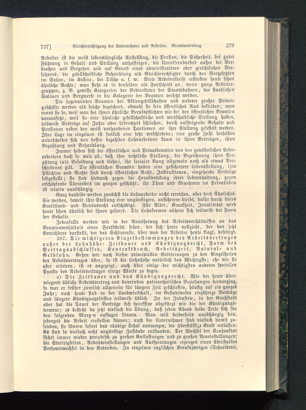 207. Die wichtigeren Einzelbestimmungen des Arbeitsvertragcsaußer der Lohnhöhe: Zeitdauer uud Kündigungsrecht, Form desVertragsabschlusses, Kontraktbruch, Arbeitszeit, Natural- uudGeldlohn. Gehen wir nach diesen principiellen Erörterungen zu den Einzelheitendes Arbeitsvertrages über, so ist die Lohnhöhe natürlich das Wichtigste; ehe wir sieaber erörtern, ist es angezeigt, auch über einige der wichtigsten anderen speciellenPunkte des Arbcitsvcrtrages einige Worte zu sagen.