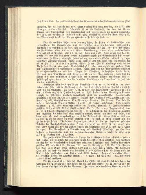 Umgekehrt stehen die Löhne in den Vereinigten Staaten, in Australien, Neu-seeland viel höher als in Westeuropa ; aber die Unterschiede sind im Reallohn nicht sogroß wie im Geldlohn. So giebt F. A. Walker eine geographische Lohnskala an, diemit 10 Cents täglich in Indien beginnt, mit 1,50 Dollar in den Vereinigten Staatenendigt; den jährlichen Landarbeiterverdienst giebt ein amerikanischer Staatssekretärneuerdings so an: Indien 150 Francs, Italien 250, Rußland 300, Deutschland 450,Frankreich 675, Großbritannien 775, Vereinigte Staaten 1250 Francs. Das sind fürmehrere europäische Staaten Zahlen, die 30 — 50 Jahre zurückliegen. Nach neuerenAngaben, z. B. über Eisenbahnarbeiter in Kansas , schwankt die Jahreseinnahmezwischen 386 und 865 Dollar (1621 — 3633 Mark). Bei einem Tagesverdienst von5—10 Schilling, Wochenverdienst von 30 — 60 Schilling in den Vereinigten Staaten und englischen Kolonien darf nicht vergessen werden, einmal wie teuer das Leben, unddann wie sehr viel unregelmäßiger meist der Verdienst ist. Wenn statt an 300 nuran 200 Tagen im Jahr ein Lohn verdient wird, so muß er schon deshalb um dieHälfte höher stehen. Die Labour Gazette giebt 1899 für die gut bezahlten gelerntenArbeiter der Trustgesellschasten einen Jahres Verdienst von 3000, für die ungelerntenVon 1490 Mark an; vor der Fusion hatten die Verdienste nur 2630 und 1250 Markbetragen. Der Unterschied in Lebenshaltung und Verdienst (Reallohn) zwischen denbesseren westeuropäischen und den nordamerikanischen Arbeitern dürste so nicht mehrals 1 : 2, vielfach nur 1 : 1,5 sein.
