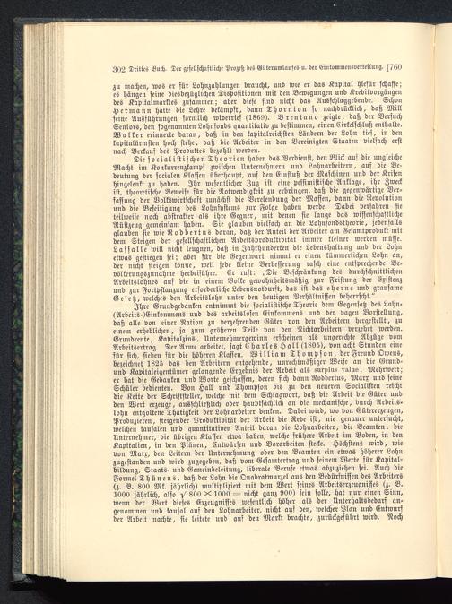 Ihre Grundgedanken entnimmt die socialistische Theorie dem Gegensatz des Lohu-(Arbcits-)Einkommens und des arbeitslosen Einkommens und der vagen Vorstellung,daß alle von einer Nation zn verzehrenden Güter von den Arbeitern hergestellt, zueinem erheblichen, ja zum größeren Teile von den Nichtarbeitern verzehrt werden.Grundrente, Kapitalzins, Unternehmergewinn erscheinen als ungerechte Abzüge vomArbeitsertrag. Der Arme arbeitet, sagt Charles Hall (1805), von acht Stunden einesür sich, sieben sür die höheren Klassen. William Thompson, der Freund Owens,bezeichnet 1825 das den Arbeitern entgehende, unrechtmäßiger Weise an die Grund-und Kapitaleigentümer gelangende Ergebnis der Arbeit als surplus valus, Mehrwert;er hat die Gedanken und Worte geschaffen, deren sich dann Rodbertus, Marx und seineSchüler bedienten. Von Hall und Thompson bis zu den neueren Socialisten reichtdie Kette der Schriftsteller, welche mit dem Schlagwort, daß die Arbeit die Güter undden Wert erzeuge, ausschließlich oder hauptsächlich an die mechanische, durch Arbeits-lohn entgoltene Thätigkeit der Lohnarbeiter denken. Dabei wird, wo von Gütererzeugen,Produzieren, steigender Produktivität der Arbeit die Rede ist, nie genauer untersucht,welchen kausalen und quantitativen Anteil daran die Lohnarbeiter, die Beamten, dieUnternehmer, die übrigen Klassen etwa haben, welche frühere Arbeit im Boden, in denKapitalien, in den Plänen, Entwürfen und Vorarbeiten stecke. Höchstens wird, wievon Marx, den Leitern der Unternehmung oder den Beamten ein etwas höherer Lohnzugestanden und wird zugegeben, daß vom Gesamtertrag und seinem Werte für Kapital-bildung, Staats- und Gemeindcleitung, liberale Berufe etwas abzuziehen sei. Auch dieFormel Thünens, daß der Lohn die Quadratwurzel aus den Bedürfnissen des Arbeiters(z. B. 800 Mk. jährlich) multipliziert mit dem Wert seines Arbeitserzeugnisses (z. B.1000 jährlich, also / 800 X1000 ^ nicht ganz 900) sein solle, hat nur einen Sinn,wenn der Wert dieses Erzeugnisses wesentlich höher als der Untcrhaltsbedarf an-genommen und kausal auf den Lohnarbeiter, nicht auf den, welcher Plan und Entwurfder Arbeit machte, sie leitete und auf den Markt brachte, zurückgeführt wird. Noch