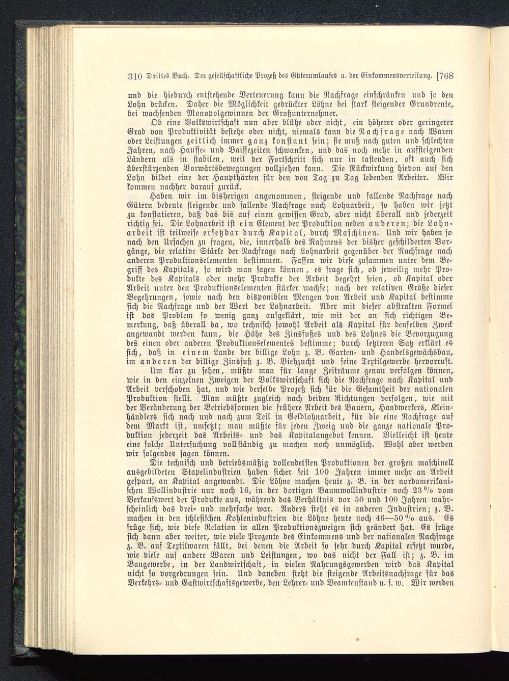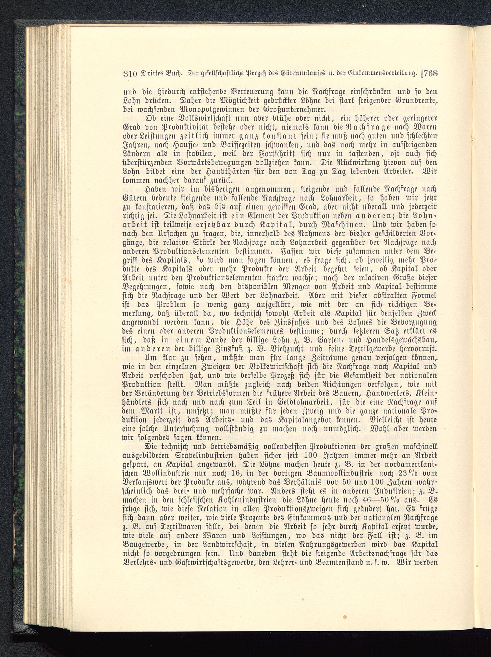 Haben wir im bisherigen angenommen, steigende und fallende Nachfrage nachGütern bedeute steigende und fallende Nachfrage nach Lohnarbeit, so haben wir jetztzu konstatieren, daß das bis auf einen gewissen Grad, aber nicht überall und jederzeitrichtig sei. Die Lohnarbeit ist ein Element der Produktion neben anderen; die Lohn-arbeit ist teilweise ersetzbar durch Kapital, durch Maschinen. Und wir haben sonach den Ursachen zu fragen, die, innerhalb des Rahmens der bisher geschilderten Vor-gänge, die relative Stärke der Nachfrage nach Lohnarbeit gegenüber der Nachfrage nachanderen Produktionselementen bestimmen. Fassen wir diese zusammen unter dem Be-griff des Kapitals, so wird man sagen können, es frage sich, ob jeweilig mehr Pro-dukte des Kapitals oder mehr Produkte der Arbeit begehrt seien, ob Kapital oderArbeit unter den Produktionselementen stärker wachse; nach der relativen Größe dieserBegehrungen, sowie nach den disponiblen Mengen von Arbeit und Kapital bestimmesich die Nachfrage und der Wert der Lohnarbeit. Aber mit dieser abstrakten Formelist das Problem so wenig ganz aufgeklärt, wie mit der an sich richtigen Be-merkung, daß überall da, wo technisch sowohl Arbeit als Kapital für denselben Zweckangewandt werden kann, die Höhe des Zinsfußes und des Lohnes die Bevorzugungdes einen oder anderen Produktionselementes bestimme; durch letzteren Satz erklärt es-sich, daß in einem Lande der billige Lohn z. B. Garten- und Handelsgewächsbau,im anderen der billige Zinsfuß z. B. Viehzucht und feine Textilgewerbe hervorruft.