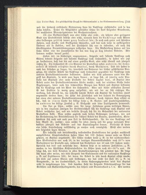 Ob eine Volkswirtschaft nun aber blühe oder nicht, ein höherer oder geringererGrad von Produktivität bestehe oder nicht, niemals kann die Nachfrage nach Warenoder Leistungen zeitlich immer ganz konstant sein; sie muß nach guten und schlechtenJahren, nach Hausse- und Baissezeiten schwanken, und das noch mehr in aufsteigendenLändern als in stabilen, weil der Fortschritt sich nur in tastenden, oft auch sichüberstürzenden Vorwärtsbewegungen vollziehen kann. Die Rückwirkung hievon auf denLohn bildet eine der Haupthärten für den von Tag zu Tag lebenden Arbeiter. Wirkommen nachher darauf zurück.