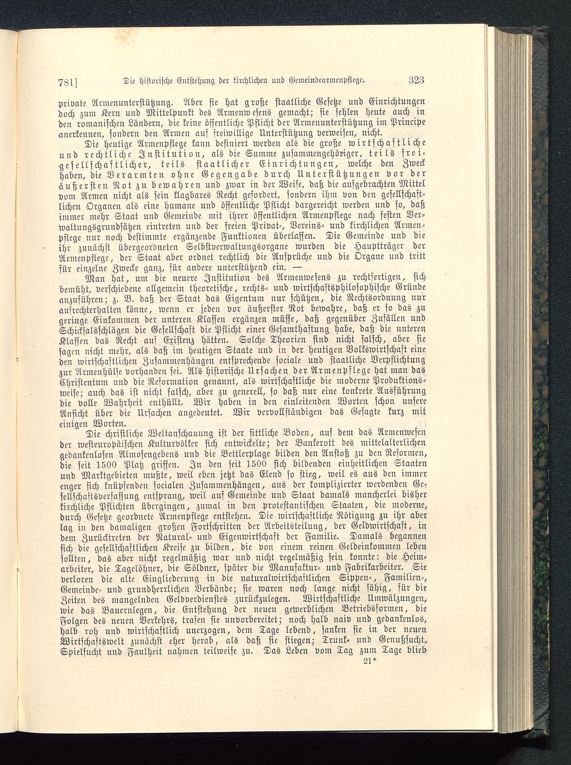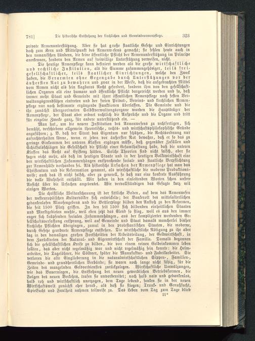 Man hat, um die neuere Institution des Armenwesens zu rechtfertigen, sichbemüht, verschiedene allgemein theoretische, rechts- und wirtschaftsphilosophische Gründeanzuführen; z. B. daß der Staat das Eigentum nur schützen, die Rechtsordnung nuraufrechterhalten könne, wenn er jeden vor äußerster Not bewahre, daß er so das zugeringe Einkommen der unteren Klassen ergänzen müsse, daß gegenüber Zufällen undSchicksalsschlägen die Gesellschast die Pflicht einer Gesamthaftung habe, daß die unterenKlassen das Recht auf Existenz hätten. Solche Theorien sind nicht salsch, aber siesagen nicht mehr, als daß im heutigen Staate und in der heutigen Volkswirtschaft eineden wirtschaftlichen Zusammenhängen entsprechende sociale und staatliche Verpflichtungzur Armenhülfe vorhanden sei. Als historische Ursachen der Armenpflege hat man dasChristentum und die Reformation genannt, als wirtschaftliche die moderne Produktions-weise; auch das ist nicht falsch, aber zu generell, so daß nur eine konkrete Ausführungdie volle Wahrheit enthüllt. Wir haben in den einleitenden Worten schon unsereAnsicht über die Ursachen angedeutet. Wir vervollständigen das Gesagte kurz miteinigen Worten.