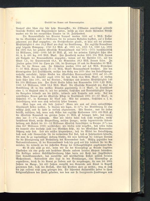 Die Armeneinkünste des Staates Neuyork wurden 1895 auf 5 Mill. Dollarfür die öffentlichen und 14 Millionen für die privaten Anstalten beziffert, auf 4 Dollarzusammen pro Kopf angegeben; ein Berichterstatter glaubt, es feien mit der privatenWohlthätigkeit 6 oder 25,2 Mark pro Kopf der Bevölkerung. Die englische Armensteuerzeigt folgende Bewegung: 1750 0,5 Mill. F, 1801 4,0, 1818 7,8, 1860 5,4, 1891bis 1895 9,2; der gesamte öffentliche Armenaufwand war 1871—1375 durchschnittlich12 Millionen, 1892—1895 fast 20 Mill. F, mit der privaten Thätigkeit sicher über30, d. h. 400 bez. 600 Mill. Mark. Für Frankreich werden 1835 184 Mill. Francsals Ausgabe der Armenanstalten angegeben, wovon auf die Spitäler 111, auf denStaat 7,5, die Departements 43,4, die Gemeinden 28,3 Mill. Francs fielen. InItalien gaben 1880 die Opere pie 135, die Provinzen 20 und die Gemeinden 63 Mill.Lire für die Armen aus. In Schweden wurden 1884 auf 4,6 Mill. Einwohner9—10 Mill. Kronen (gleich 10—11 Mill. Mark) Armenaufwand berechnet. Für denüberwiegenden Teil Deutschlands , welcher dem Gesetz von 1870 über den Unterstützungs-wohnsitz untersteht, schätzte Adickes den öffentlichen Armcnaufwand 1881 auf 50—60Mill. Mark; die Statistik ergab 1885 für das Reich 92,4 Mill. Mark; es dürftenheute sicher über 100, mit der Vereins-, kirchlichen und privaten Wohlthätigkeit 140bis 150 Millionen sein. Der Stadt Berlin kostete das Armenwesen 1806 0,22 Mill.,1861 1,8 Millionen, 1898 16,2 Mill. Mark. Die öffentliche Armenlast pro Kopf derBevölkerung ist in den meisten Staaten gegenwärtig 2—4 Mark, in Deutschland etwa 3, in England etwa 6; mit der privaten, kirchlichen und Vereinsthätigkeit steigendie Ausgaben teilweise um die Hälfte, teilweise aufs Doppelte und mehr. Auf denunterstützten Armen gab die öffentliche Pflege in Deutschland 1885 40—57 Mark, inSchweden 87, in Norwegen 42 Mark aus. Mit der privaten, kirchlichen u. s. w.Unterstützung wird man auch wesentlich höher kommen.