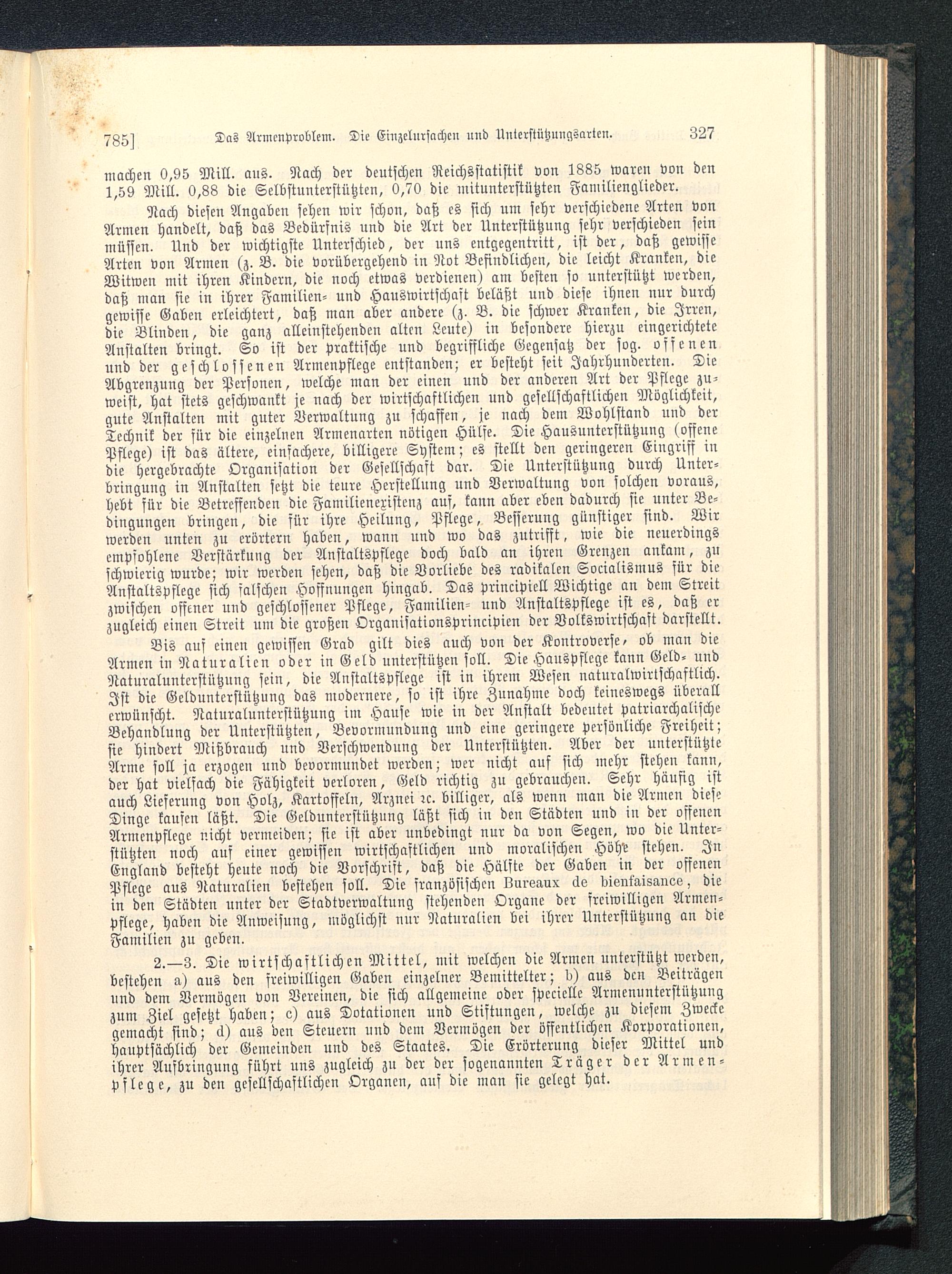 Nach diesen Angaben sehen wir schon, daß es sich um sehr verschiedene Arten vonArmen handelt, daß das Bedürfnis und die Art der Unterstützung sehr verschieden seinmüssen. Und der wichtigste Unterschied, der uns entgegentritt, ist der, daß gewisseArten von Armen (z. B. die vorübergehend in Not Befindlichen, die leicht Kranken, dieWitwen mit ihren Kindern, die noch etwas verdienen) am besten so unterstützt werden,daß man sie in ihrer Familien- und Hauswirtschaft beläßt und diese ihnen nur durchgewisse Gaben erleichtert, daß man aber andere (z. B. die schwer Kranken, die Irren,die Blinden, die ganz alleinstehenden alten Leute) in besondere hierzu eingerichteteAnstalten bringt. So ist der praktische und begriffliche Gegensatz der sog. offenenund der geschlossenen Armenpflege entstanden; er besteht seit Jahrhunderten. DieAbgrenzung der Personen, welche man der einen und der anderen Art der Pflege zu-weist, hat stets geschwankt je nach der wirtschaftlichen und gesellschaftlichen Möglichkeit,gute Anstalten mit guter Verwaltung zu schaffen, je nach dem Wohlstand und derTechnik der für die einzelnen Armenarten nötigen Hülfe. Die Hausunterstützung (offenePflege) ist das altere, einfachere, billigere System; es stellt den geringeren Eingriff indie hergebrachte Organisation der Gesellschaft dar. Die Unterstützung durch Unter-bringung in Anstalten setzt die teure Herstellung und Verwaltung von solchen voraus,hebt sür die Betreffenden die Familieneristcnz aus, kann aber eben dadurch sie unter Be-dingungen bringen, die für ihre Heilung, Pflege, Besserung günstiger sind. Wirwerden unten zu erörtern haben, wann und wo das zutrifft, wie die neuerdingsempfohlene Verstärkung der Anstaltspflege doch bald an ihren Grenzen ankam, znschwierig wurde; wir werden sehen, daß die Vorliebe des radikalen Socialismus für dieAnstaltspflege sich falschen Hoffnungen hingab. Das principiell Wichtige an dem Streitzwischen offener und geschlossener Pflege, Familien- und Anstaltspflege ist es, daß erzugleich einen Streit um die großen Organisationsprincipicn der Volkswirtschaft darstellt.