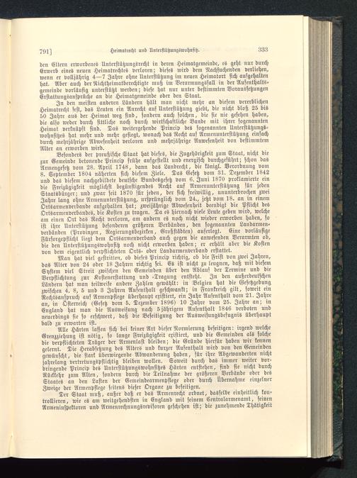 Man hat viel gestritten, ob dieses Princip richtig, ob die Frist von zwei Jahren,das Alter von 24 oder 18 Jahren richtig sei. Es ist nicht zu leugnen, daß mit diesemSystem viel Streit zwischen den Gemeinden über den Ablauf der Termine und dieVerpflichtung zur Kostenerstattung und -Tragung entsteht. In den außcrdeutschenLändern hat man teilweise andere Zahlen gewählt: in Belgien hat die Gesetzgebungzwischen 4. 8, 5 und 3 Jahren Aufenthalt geschwankt; in Frankreich gilt, soweit einRechtsanspruch auf Armenpflege überhaupt existiert, ein Jahr Aufenthalt vom 21. Jahrean, in Osterreich (Gesetz vom 5. Dezember 1896) 10 Jahre vom 25. Jahre an; inEngland hat man die Ausweisung nach 5 jährigem Aufenthalt 1846 verboten undneuerdings sie so erschwert, daß die Beseitigung der Ausweisungsbefuguis überhauptbald zu erwarten ist.
