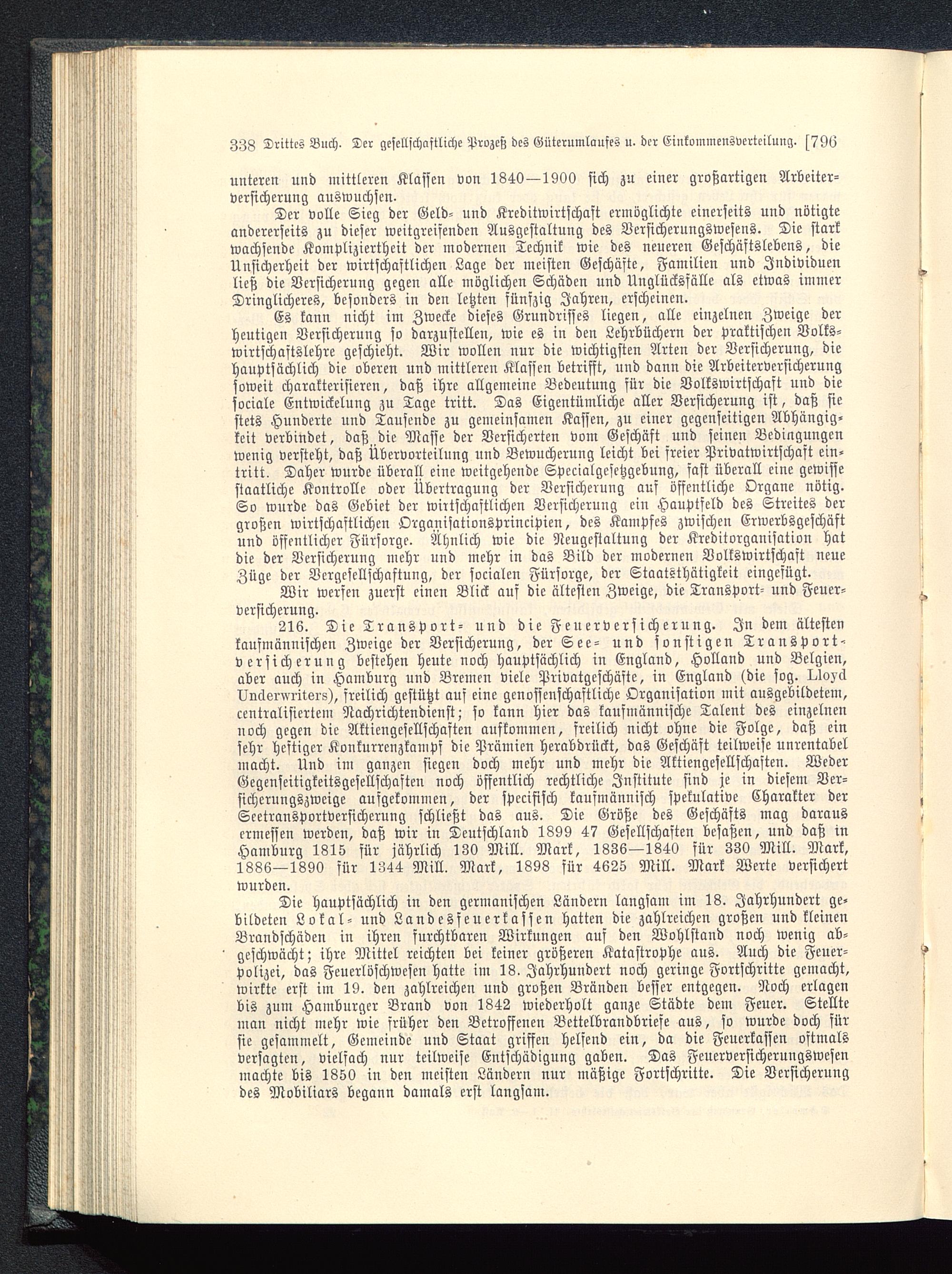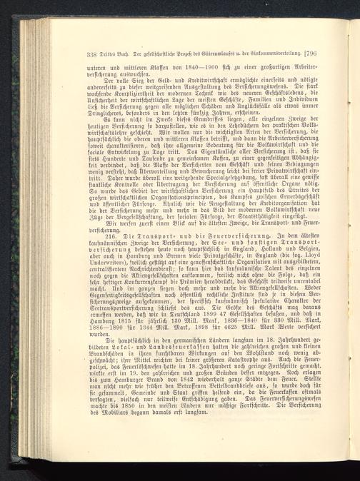Der volle Sieg der Geld- und Kreditwirtschaft ermöglichte einerseits und nötigteandererseits zu dieser weitgreifenden Ausgestaltung des Versicherungswesens. Die starkwachsende Kompliziertheit der modernen Technik wie des neueren Geschäftslebens, dieUnsicherheit der wirtschaftlichen Lage der meisten Geschäfte, Familien und Individuenließ die Versicherung gegen alle möglichen Schäden und Unglückssälle als etwas immerDringlicheres, besonders in den letzten fünfzig Jahren, erscheinen.