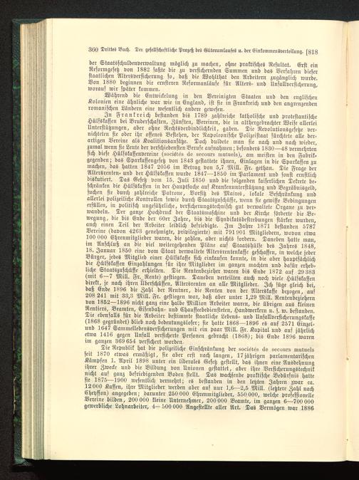 In Frankreich bestanden bis 1789 zahlreiche katholische und protestantischeHülfskasscn bei Bruderschaften, Zünften, Vereinen, die in althergebrachter Weise allerleiUnterstützungen, aber ohne Rechtsverbindlichkeit, gaben. Die Revolutionsgcsetze ver-nichteten sie oder ihr offenes Bestehen, der Napoleonische Polizeistaat fürchtete alle der-artigen Vereine als Koalitionsansätze. Doch duldete man sie nach und nach wieder,zumal wenn sie Leute der verschiedensten Berufe aufnahmen; besonders 1830—48 vermehrtensich diese Hülfskassenvereine (soeiötös äs seoours muwkl8), am meisten in den Fabrik-gegenden; das Sparkassengesetz von 1843 gestattete ihnen, Einlagen in die Sparkassen zumachen, das hatten 1847 2056 im Betrag von 5,7 Mill. Fr. gethan. Die Frage derAltersrenten- und der Hülfskassen wurde 1847—1850 im Parlament und sonst ernstlichdiskutiert. Das Gesetz vom 15. Juli 1850 und die folgenden kaiserlichen Dekrete be-schränken die Hülfskassen in der Hauptsache auf Krankenunterstützung und Vegräbnisgeld,suchen sie durch zahlreiche Patrone, Vorsitz des Maires, lokale Beschränkung undallerlei polizeiliche Kontrollen sowie durch Staatszuschüsse, wenn sie gewisse Bedingungenerfüllen, in politisch ungefährliche, versicherungstechnisch gut verwaltete Organe zu ver-wandeln. Der ganze Hochdruck der Staatsmaschine und der Kirche förderte die Be-wegung, die bis Ende der 60er Jahre, bis die Syndikatsbestrebungen stärker wurden,auch einen Teil der Arbeiter leidlich befriedigte. Im Jahre 1871 bestanden 5787Vereine (davon 4263 genehmigte, privilegierte) mit 791 901 Mitgliedern, wovon etwa100 000 Ehrenmitglieder waren, die zahlen, aber nichts fordern. Daneben hatte man,im Anschluß an die viel weitergehenden Pläne auf Staatshülfe des Jahres 1848,18. Januar 1850 eine vom Staat verwaltete Altersrentenkassc geschaffen, in welche jederBürger, jedes Mitglied einer Hülfskasse sich einkaufen konnte, in die aber hauptsächlichdie Hülfskassen Einzahlungen für ihre Mitglieder im ganzen machten und dafür erheb-liche Staatszuschüsse erhielten. Die Rentenbezieher waren bis Ende 1872 auf 29 383(mit 6—7 Mill. Fr. Rente) gestiegen. Daneben verteilten auch noch viele Hülfskassendirekt, je nach ihren Überschüssen, Altersrenten an alle Mitglieder. Ich füge gleich bei,daß Ende 1896 die Zahl der Rentner, die Renten von der Alterskasse bezogen, auf208 241 mit 33,3 Mill. Fr. gestiegen war, daß aber unter 1,29 Mill. Rentenbeziehernvon 1852—1896 nicht ganz eine halbe Million Arbeiter waren, die übrigen aus kleinenRentiers, Beamten, Eisenbahn- und Chausseebediensteten, Handwerkern u. s. w. bestanden.Die ebenfalls für die Arbeiter bestimmte staatliche Lebens- und Unfallversicherungskasse(1868 gegründet) blieb noch bedeutungsloser; sie hatte 1868—1896 es auf 2571 Einzel-und 1647 Sammellebensversicherungen mit ein paar Mill. Fr. Kapital und auf jährlichetwa 1416 gegen Unfall versicherte Personen gebracht (1368); bis Ende 1896 warenim ganzen 369 654 versichert worden-
