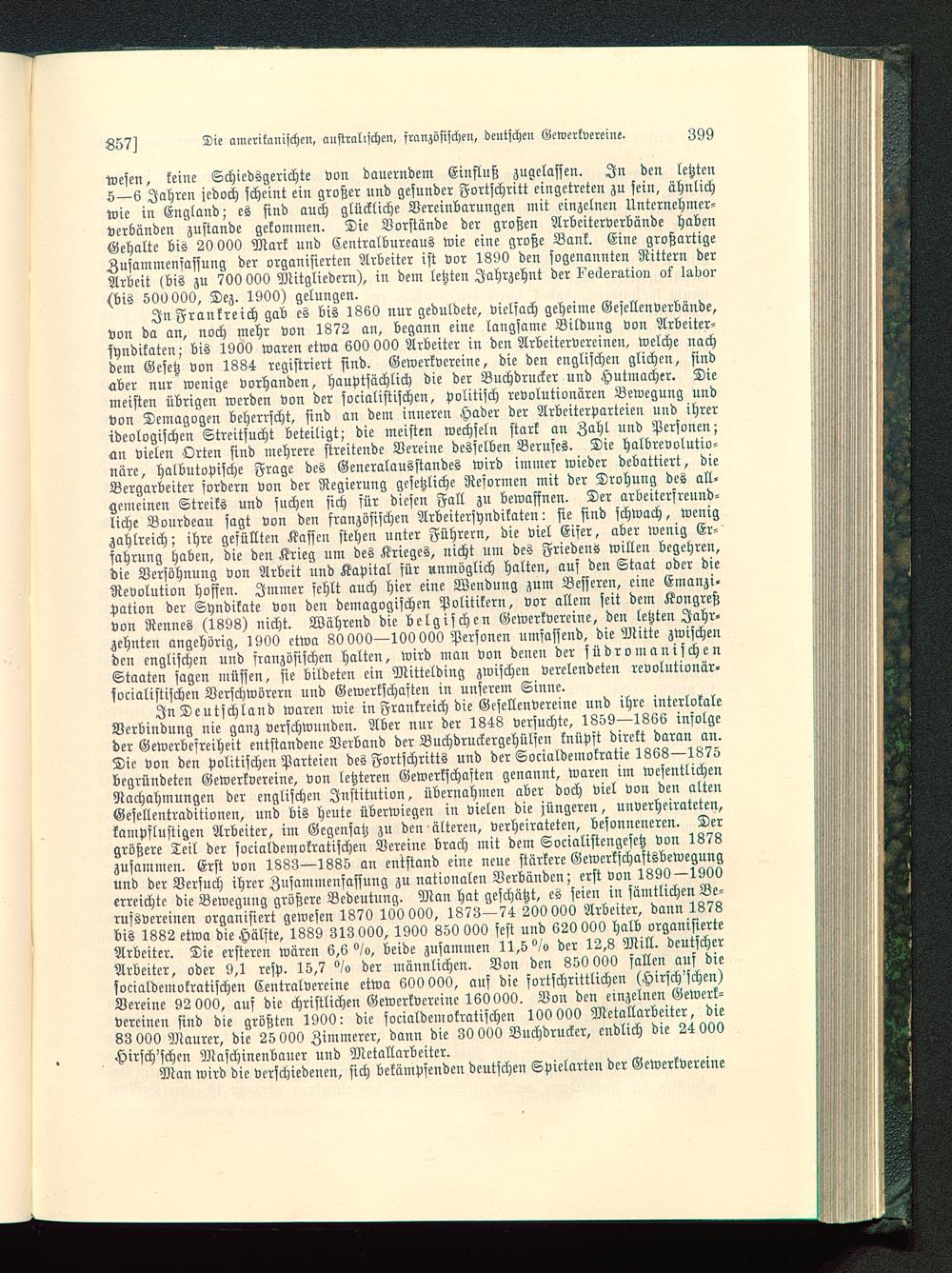 In Frankreich gab es bis 1860 nur geduldete, vielfach geheime Gesellenverbände,von da an, noch mehr von 1872 an, begann eine langsame Bildung von Arbeiter-syndikaten; bis 1900 waren etwa 600 000 Arbeiter in den Arbeitervereinen, welche nachdem Gesetz von 1884 registriert sind. Gewerkvereine, die den englischen glichen, sindaber nur wenige vorhanden, hauptsächlich die der Buchdrucker und Hutmachcr. Diemeisten übrigen werden von der socialistischen, politisch revolutionären Bewegung undvon Demagogen beherrscht, sind an dem inneren Hader der Arbeiterparteien und ihrerideologischen Streitsucht beteiligt; die meisten wechseln stark an Zahl und Personen;an vielen Orten sind mehrere streitende Vereine desselben Berufes. Die halbrevolutio-näre, halbutopische Frage des Generalausstandes wird immer wieder debattiert, dieBergarbeiter fordern von der Regierung gesetzliche Reformen mit der Drohung des all-gemeinen Streiks und suchen sich für diesen Fall zu bewaffnen. Der arbcitersreund-liche Bourdeau sagt von den französischen Arbeitersyndikaten: sie sind schwach, wenigzahlreich; ihre gefüllten Kassen stehen unter Führern, die viel Eifer, aber wenig Er-sahrung haben, die den Krieg um des Krieges, nicht um des Friedens willen begehren,die Versöhnung von Arbeit und Kapital für unmöglich halten, aus den Staat oder dieRevolution hoffen. Immer fehlt auch hier eine Wendung zum Besseren, eine Emanzi-pation der Syndikate von den demagogischen Politikern, vor allem seit dem Kongreßvon Rennes (1898) nicht. Während die belgischen Gewerkvereine, den letzten Jahr-zehnten angehörig, 1900 etwa 80 000-100 000 Personen umfassend, die Mitte zwischenden englischen und französischen halten, wird man von denen der südromanischenStaaten sagen müssen, sie bildeten ein Mittelding zwischen verelendeten revolutionär-socialistischen Verschwörern und Gewerkschaften in unserem Sinne.