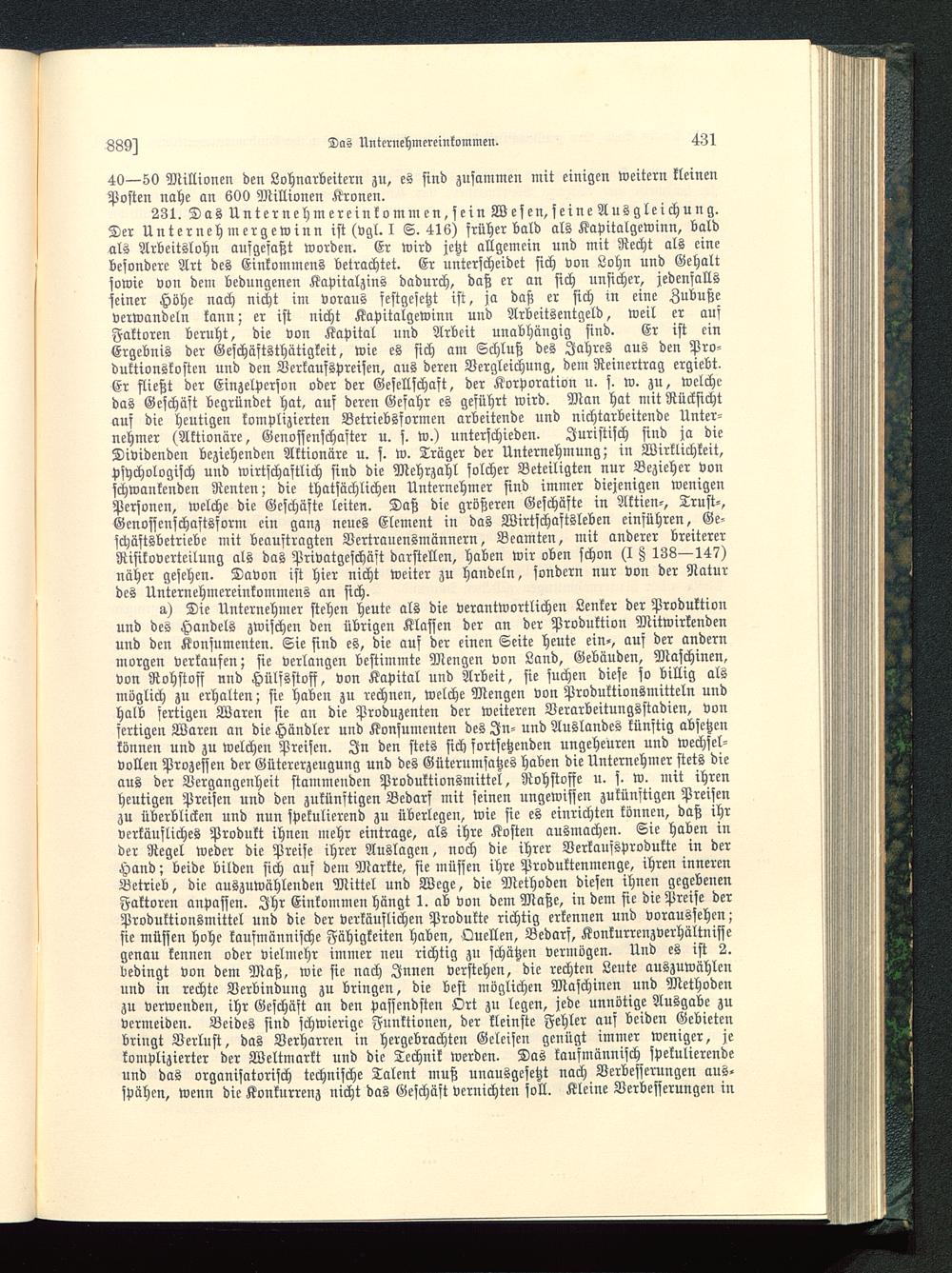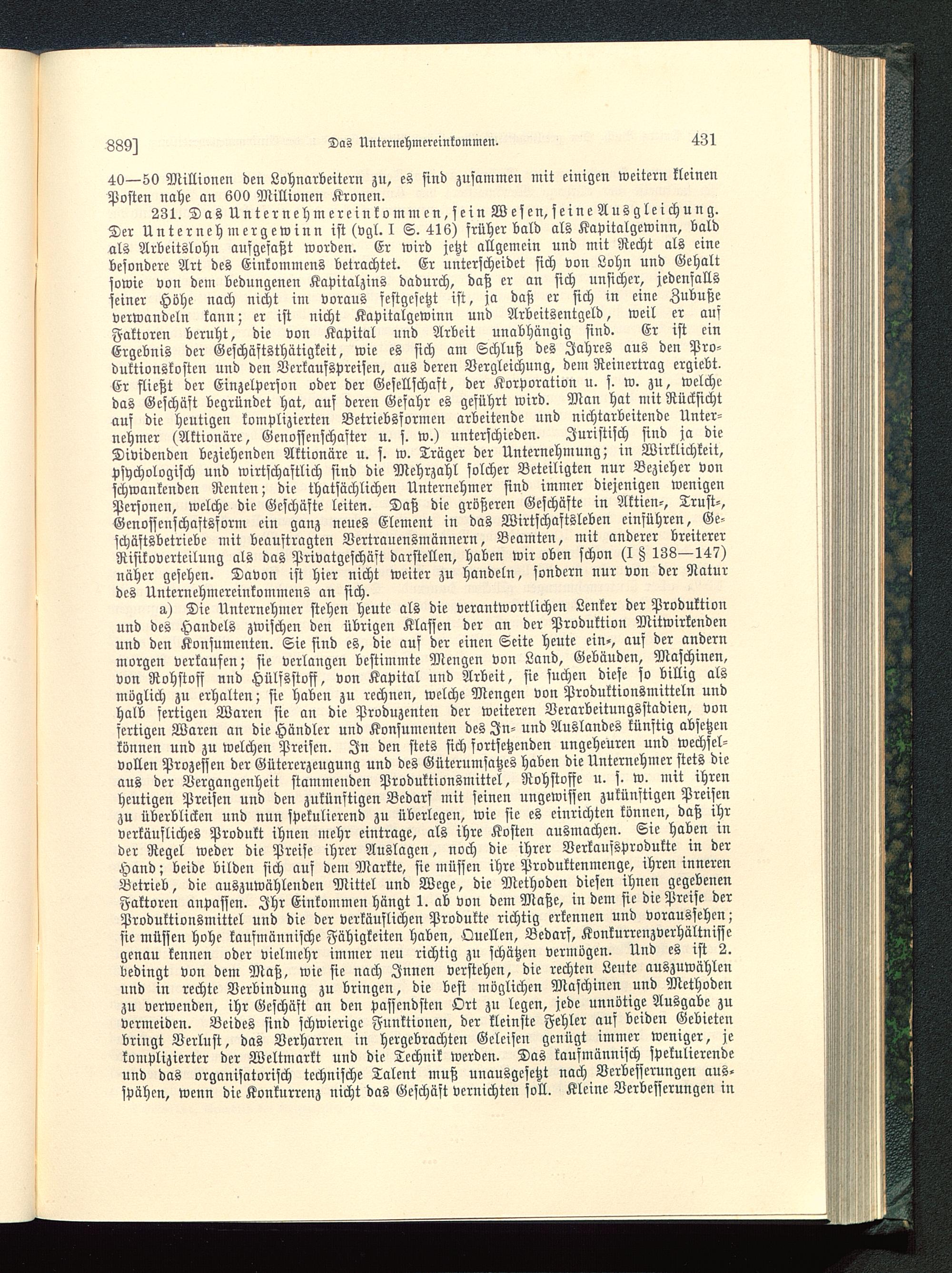 231. Das Unter nehm ereinko mm en, sein Wesen, seine Aus gl ei chung.Der Unternehmergewinn ist (vgl. I S. 416) früher bald als Kapitalgewinn, baldals Arbeitslohn aufgesaßt worden. Er wird jetzt allgemein und mit Recht als einebesondere Art des Einkommens betrachtet. Er unterscheidet sich von Lohn und Gehaltsowie von deni bedungenen Kapitalzins dadurch, daß er an sich unsicher, jedenfallsseiner Höhe nach nicht im voraus festgesetzt ist, ja daß er sich in eine Zubußeverwandeln kann; er ist nicht Kapitalgewinn und Arbeitsentgeld, weil er aufFaktoren beruht, die von Kapital nnd Arbeit unabhängig sind. Er ist einErgebnis der Geschäftsthätigkeit, wie es sich am Schluß des Jahres aus den Pro-duktionskosten und den Verkaufspreisen, aus deren Vergleichung, dem Reinertrag ergiebt.Er fließt der Einzelperson oder der Gesellschaft, der Korporation u. s. w. zu, welchedas Geschäft begründet hat, auf deren Gefahr es geführt wird. Man hat mit Rücksichtauf die heutigen komplizierten Betriebsformen arbeitende und nichtarbeitende Unter-nehmer (Aktionäre, Genossenschafter u. s. w.) unterschieden. Juristisch sind ja dieDividenden beziehenden Aktionäre u. s. w. Träger der Unternehmung; in Wirklichkeit,psychologisch und wirtschaftlich sind die Mehrzahl solcher Beteiligten nur Bezieher vonschwankenden Renten; die thatsächlichen Unternehmer sind immer diejenigen wenigenPersonen, welche die Geschäfte leiten. Daß die größeren Geschäfte in Aktien-, Trust-,Genosscnschaftsform ein ganz neues Element in das Wirtschaftsleben einführen, Ge-fchäftsbetriebe mit beauftragten Vertrauensmännern, Beamten, mit anderer breitererRisikoverteilung als das Privatgeschäft darstellen, haben wir oben schon (I § 138—147)näher gesehen. Davon ist hier nicht weiter zu handeln, sondern nur von der Naturdes Unternehmereinkommens an sich.