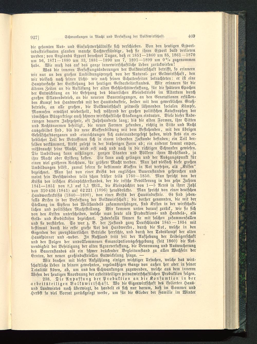Was die inneren Verfassungsänderungen der Volkswirtschaft betrifft, so erinnernwir nur an den großen Umbildungsprozeß von der Natural- zur Geldwirtschaft, denwir vielfach nach seinen Licht- wie nach seinen Schattenfeiten betrachteten: er ist eineHauptursache der Entstehung des heutigen Geldarbeiterstandes. Wir erinnern für dieälteren Zeiten an die Auflösung der alten Geschlechtsverfassung, für die späteren Epochender Entwickelung an die Ersetzung des bäuerlichen Kleinbetriebs im Altertum durchgroßen Sklavenbetrieb, an die neueren Bauernlegungen, an den Generationen erfüllen-den Kampf des Handwerkes mit der Hausindustrie, beider mit dem gewerblichen Groß-betriebe, an alle großen, die Volkswirtschaft zeitweife lähmenden socialen Kämpfe.Mommsen erwähnt wiederholt, daß während der großen politischen Katastrophen derrömischen Bürgerkriege auch schwere wirtschastliche Stockungen eintraten. Viele dieser Ände-rungen dauern Jahrzehnte, oft Jahrhunderte lang; bis die alten Formen, ihre Sittenund Rechtsnormen beseitigt, die neuen Formen gefunden, richtig in Sitte und Rechtausgebildet sind, bis die neue Klassenbildung mit dem Bestehenden, mit den übrigenGesellschastsorganen und -einrichtungen sich auseinandergesetzt haben, wird stets ein er-heblicher Teil der Betroffenen sich in einem leidenden Zustande befinden; ein Teil der-selben verkümmert, stirbt zuletzt in der bisherigen Form ab; ein anderer kommt empor,mißbraucht seine Macht, wird erst nach und nach in die richtigen Schranken gewiesen.Die Umbildung kann mißlingen, ganzen Staaten und Völkern ihren Wohlstand, jaihre Macht oder Existenz kosten. Sie kann auch gelingen und der Ausgangspunkt füreinen viel größeren Reichtum, sür größere Macht werden. Man hat vielfach diese großenUmbildungen selbst, zumal sosern sie bestimmte Klassen in Not versetzen, als „Krisen"bezeichnet. Man hat von einer Krisis des englischen Bauernstandes gesprochen undmeint sein Verschwinden teils schon früher teils 1760—1850. Man spricht von derKrisis des irischen Kleinpächterstandes, der die irische Bevölkerung in den zehn Jahren1841—1351 von 8,1 aus 5,1 Mill., die Kleinpächter von 1—5 Acres in ihrer Zahlvon 310436 (1841) auf 62221 (1896) herabdrückte. Man spricht von einer deutschenHandwerkerkrisis (1840—1890), von einer Krisis der Hausindustrie. Es sind jeden-falls Krisen in der Verfassung der Volkswirtschaft; die vorher genannten, die mit derStellung im System des Welthandels zusammenhängen, sind Krisen in der wirtschaft-lichen und politischen Machtstellung. Wir kommen unten darauf zurück, wie sie sichvon den Krisen unterscheiden, welche man heute als Produktions- und Handels-, alsGeld- und Kreditkrisen bezeichnet. Jedenfalls können sie mit solchen zusammenfallenund sie verstärken. So war z. B. der Zustand ganz Deutschlands 1845 — 1854 mitbestimmt durch die erste große Not des Handwerkes, durch die Not, welche in denGegenden der zwergbäuerlichen Betriebe herrschte, und durch den Todeskampf der altenHausfpinner und -Weber. In Rußland tritt seit der Aufhebung der Leibeigenschaftund den Folgen der unvollkommenen Emancipationsgesetzgebung (seit 1860) die Not-wendigkeit der Beseitigung der alten Agrarverfassung, die Verarmung und AusWucherungdes Bauernstandes als ein schwer drückender Begleitumstand zu allen Wechseln derErnten, der neuen großindustriellen Entwickelung hinzu. —