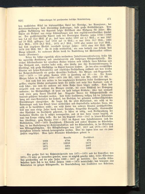 Ein großer Teil der Schwindelperiode von 1871—1873 und der Depression von1875—79 wäre zu vermeiden gewesen, wenn es möglich gewesen wäre, diesen Eisenbahn-bau gleichmäßig auf die zehn Jahre 1868 — 1877 zu verteilen. Der deutsche Eisen-bahnbau hatte sich in den sieben Jahren 1868 —1875 vervierfacht; das bedeutete eineRevolution im ganzen Eisengewerbe, die Neueinstellung von Tausenden von Arbeitern,