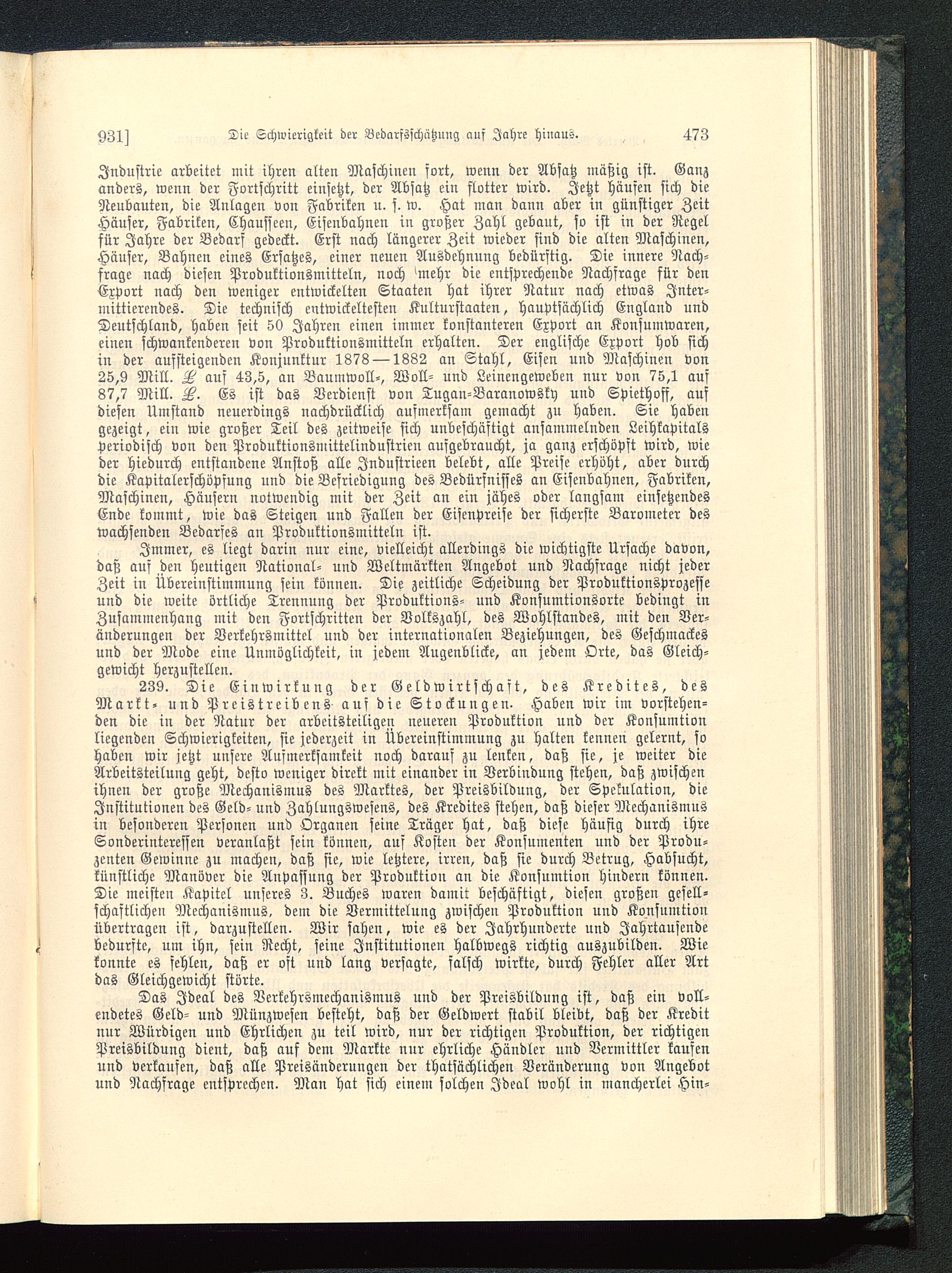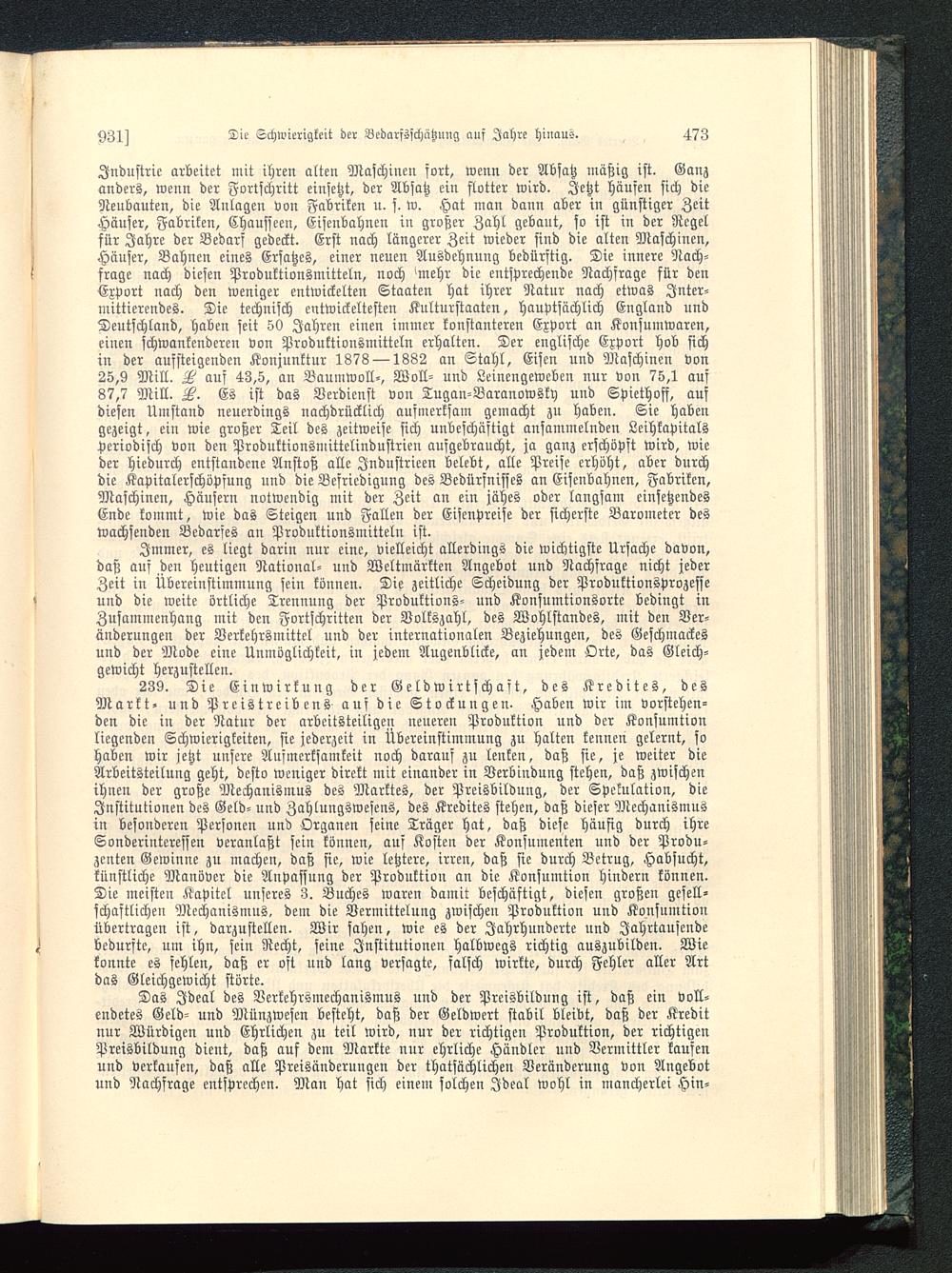 239. Die Einwirkung der Geldwirtschaft, des Kredites, desMarkt- und Preistreibens auf die Stockungen. Haben wir im vorstehen-den die in der Natur der arbeitsteiligen neueren Produktion und der Konsumtionliegenden Schwierigkeiten, sie jederzeit in Übereinstimmung zu halten kennen gelernt, sohaben wir jetzt unsere Aufmerksamkeit noch darauf zu leuken, daß sie, je weiter dieArbeitsteilung geht, desto weniger direkt mit einander in Verbindung stehen, daß zwischenihnen der große Mechanismus des Marktes, der Preisbildung, der Spekulation, dieInstitutionen des Geld- und Zahlungswesens, des Kredites stehen, daß dieser Mechanismusin besonderen Personen und Organen seine Träger hat, daß diese häufig durch ihreSonderinteressen veranlaßt sein können, auf Kosten der Konsumenten und der Produ-zenten Gewinne zu machen, daß sie, wie letztere, irren, daß sie durch Betrug, Habsucht,künstliche Manöver die Anpassung der Produktion an die Konsumtion hindern können.Die meisten Kapitel unseres 3. Buches waren damit beschäftigt, diesen großen gesell-schaftlichen Mechanismus, dem die Vermittelung zwischen Produktion und Konsumtionübertragen ist, darzustellen. Wir sahen, wie es der Jahrhunderte und Jahrtausendebedurste, um ihn, sein Recht, seine Institutionen halbwegs richtig auszubilden. Wiekonnte es fehlen, daß er oft und lang versagte, salsch wirkte, durch Fehler aller Artdas Gleichgewicht störte.