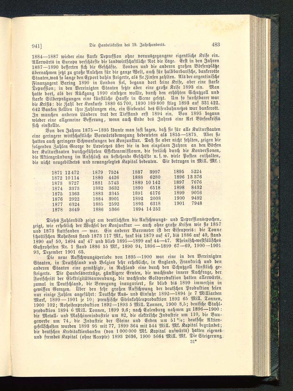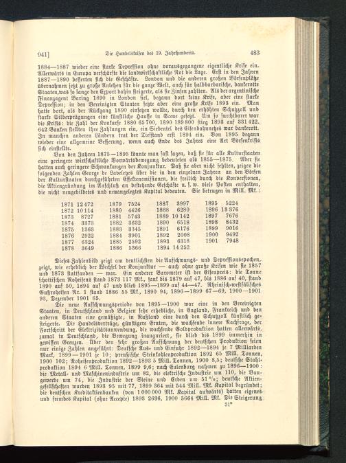 1834—1837 wieder eine starke Depression ohne vorausgegangene eigentliche Krise ein.Allerwärts in Europa verschärfte die landwirtschaftliche Not die Lage. Erst in den Jahren1387—1890 besserten sich die Geschäfte. London und die anderen großen Börsenplätzeübernahmen jetzt zu große Anlehen für die ganze Welt, auch für halbbarbarische, bankerotteStaaten,was so lange den Export dahin steigerte, als sie Zinsen zahlten. Als der argentinischeFinanzagcnt Baring 1890 in London fiel, begann dort keine Krise, aber eine starkeDepression; in den Vereinigten Staaten setzte aber eine große Krise 1893 ein. Manhatte dort, als der Rückgang 1890 einsetzen wollte, durch den erhöhten Schutzzoll undstarke Silberprägungen eine künstliche Hausse in Scene gesetzt. Um so furchtbarer wardie Krisis: die Zahl der Konkurse 1330 65 700, 1890 189 800 stieg 1393 aus 331422.642 Banken stellten ihre Zahlungen ein, ein Siebentel des Eisenbahnnetzes war bankerott.In manchen anderen Ländern trat der Tiefstand erst 1894 ein. Von 1895 begannwieder eine allgemeine Besserung, wenn auch Ende des Jahres eine Art Börsenkrisissich einstellte.