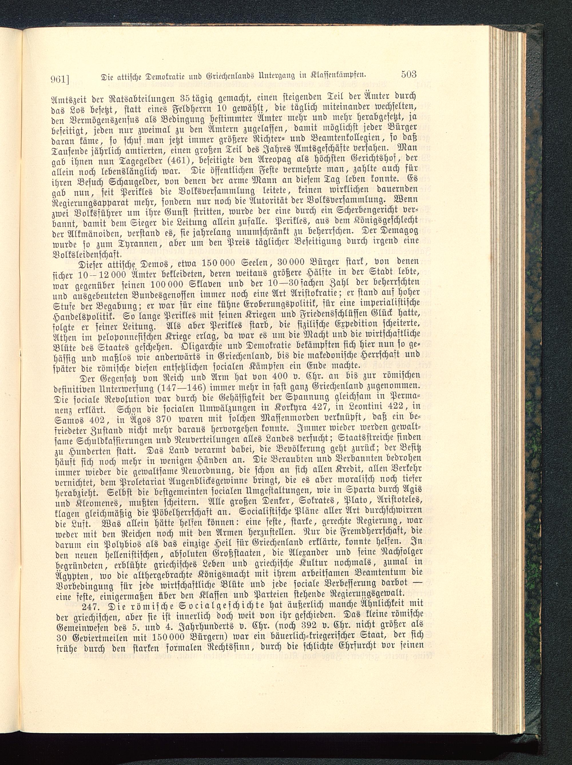Der Gegensatz von Reich und Arm hat von 400 v. Chr. an bis zur römischendefinitiven Unterwerfung (147—146) immer mehr in fast ganz Griechenland zugenommen.Die sociale Revolution war durch die Gehässigkeit der Spannung gleichsam in Perma-nenz erklärt. Schon die socialen Umwälzungen in Korkyra 427, in Leontini 422, inSamos 402, in Ägos 370 waren mit solchen Massenmorden verknüpft, daß ein be-friedeter Zustand nicht mehr daraus hervorgehen konnte. Immer wieder werden gewalt-same Schuldkassicrungen und Neuverteilungen alles Landes versucht; Staatsstreiche findenzu Hunderten statt. Das Land verarmt dabei, die Bevölkerung geht zurück; der Besitzhäuft sich noch mehr in wenigen Händen an. Die Beraubten und Verbannten bedrohenimmer wieder die gewaltsame Neuordnung, die schon an sich allen Kredit, allen Verkehrvernichtet, dem Proletariat Augenblicksgewinne bringt, die es aber moralisch noch tieserherabzieht. Selbst die bestgemeinten socialen Umgestaltungen, wie in Sparta durch Agisund Kleomenes, mußten scheitern. Alle großen Denker, Sokrates, Plato, Aristoteles ,klagen gleichmäßig die Pöbelherrschaft an. Socialistische Pläne aller Art durchfchwirrendie Luft. Was allein hätte helfen können: eine feste, starke, gerechte Regierung, warweder mit den Reichen noch mit den Armen herzustellen. Nur die Fremdherrschaft, diedarum ein Polybios als das einzige Heil für Griechenland erklärte, konnte helfen. Inden neuen hellenistischen, absoluten Großstaaten, die Alexander und seine Nachsolgerbegründeten, erblühte griechisches Leben und griechische Kultur nochmals, zumal inÄgypten , wo die althergebrachte Königsmacht mit ihrem arbeitsamen Beamtentum dieVorbedingung für jede wirtschaftliche Blüte und jede fociale Verbesserung darbot —eine feste, einigermaßen über den Klassen und Parteien stehende Regierungsgewalt.