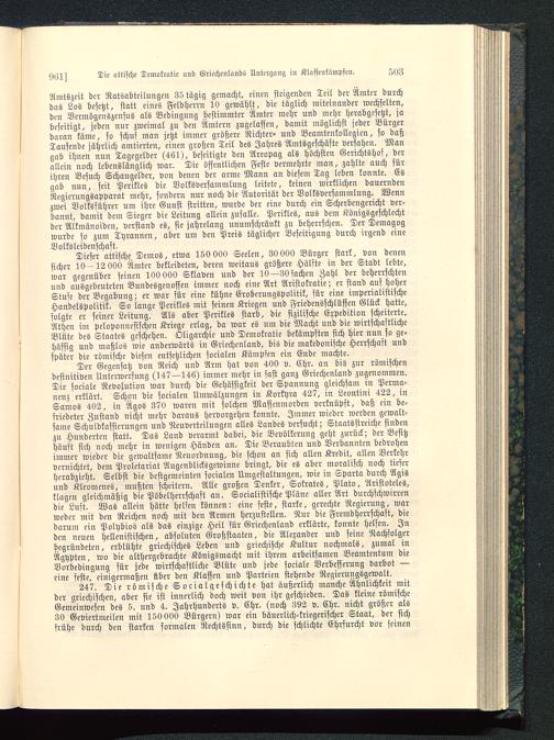 247. Die römische Socialgeschichte hat äußerlich manche Ähnlichkeit mitder griechischen, aber sie ist innerlich doch weit von ihr geschieden. Das kleine römischeGemeinwesen des 5. und 4. Jahrhunderts v. Chr. (noch 392 v. Chr. nicht größer als30 Geviertmeilen mit 150 000 Bürgern) war ein bäuerlich-kriegerischer Staat, der sichfrühe durch den starken formalen Rechtssinn, durch die schlichte Ehrfurcht vor seinen