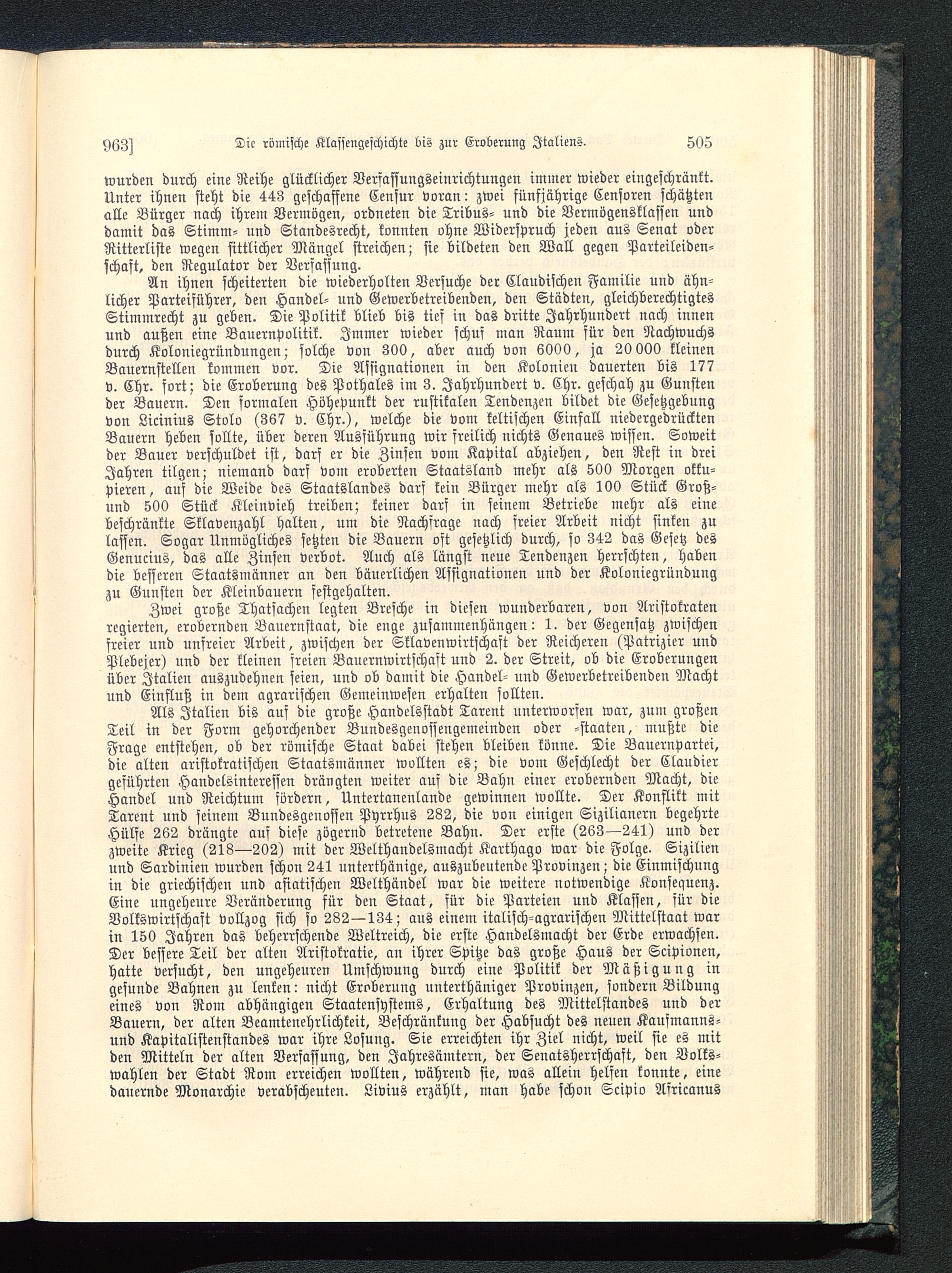 An ihnen scheiterten die wiederholten Versuche der Claudischen Familie und ähn-licher Parteiführer, den Handel- und Gewerbetreibenden, den Städten, gleichberechtigtesStimmrecht zu geben. Die Politik blieb bis tief in das dritte Jahrhundert nach innenund außen eine Bauernpolitik. Immer wieder schuf man Raum für den Nachwuchsdurch Koloniegründungen; solche von 300, aber auch von 6000, ja 20 000 kleinenBauernstellen kommen vor. Die Assignationen in den Kolonien dauerten bis 177v. Chr. fort; die Eroberung des Pothales im 3. Jahrhundert v. Chr. geschah zu Gunstender Bauern. Den formalen Höhepunkt der rustikalen Tendenzen bildet die Gesetzgebungvon Licinius Stolo (367 v. Chr.), welche die vom keltischen Einfall niedergedrücktenBauern heben sollte, über deren Ausführung wir freilich nichts Genaues wissen. Soweitder Bauer verschuldet ist, dars er die Zinsen vom Kapital abziehen, den Rest in dreiJahren tilgen; niemand darf vom eroberten Staatsland mehr als 500 Morgen okku-pieren, auf die Weide des Staatslandes darf kein Bürger mehr als 100 Stück Groß-und 500 Stück Kleinvieh treiben; keiner darf in seinem Betriebe mehr als einebeschränkte Sklavenzahl halten, um die Nachfrage nach freier Arbeit nicht sinken zulassen. Sogar Unmögliches setzten die Bauern oft gesetzlich durch, so 342 das Gesetz desGenucius, das alle Zinsen verbot. Auch als längst neue Tendenzen herrschten, habendie besseren Staatsmänner an den bäuerlichen Assignationen und der Koloniegründungzu Gunsten der Kleinbauern sestgehalten.