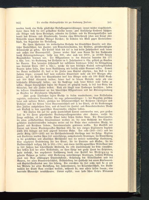 Zwei große Thatsachen legten Bresche in diesen wunderbaren, von Aristokratenregierten, erobernden Bauernstaat, die enge zusammenhängen: 1. der Gegensatz zwischensreier und unfreier Arbeit, zwischen der Sklavenwirtschaft der Reicheren (Patrizier undPlebejer) und der kleinen freien Bauernwirtschaft und 2. der Streit, ob die Eroberungenüber Italien auszudehnen seien, und ob damit die Handel- und Gewerbetreibenden Machtund Einfluß in dem agrarischen Gemeinwesen erhalten sollten.