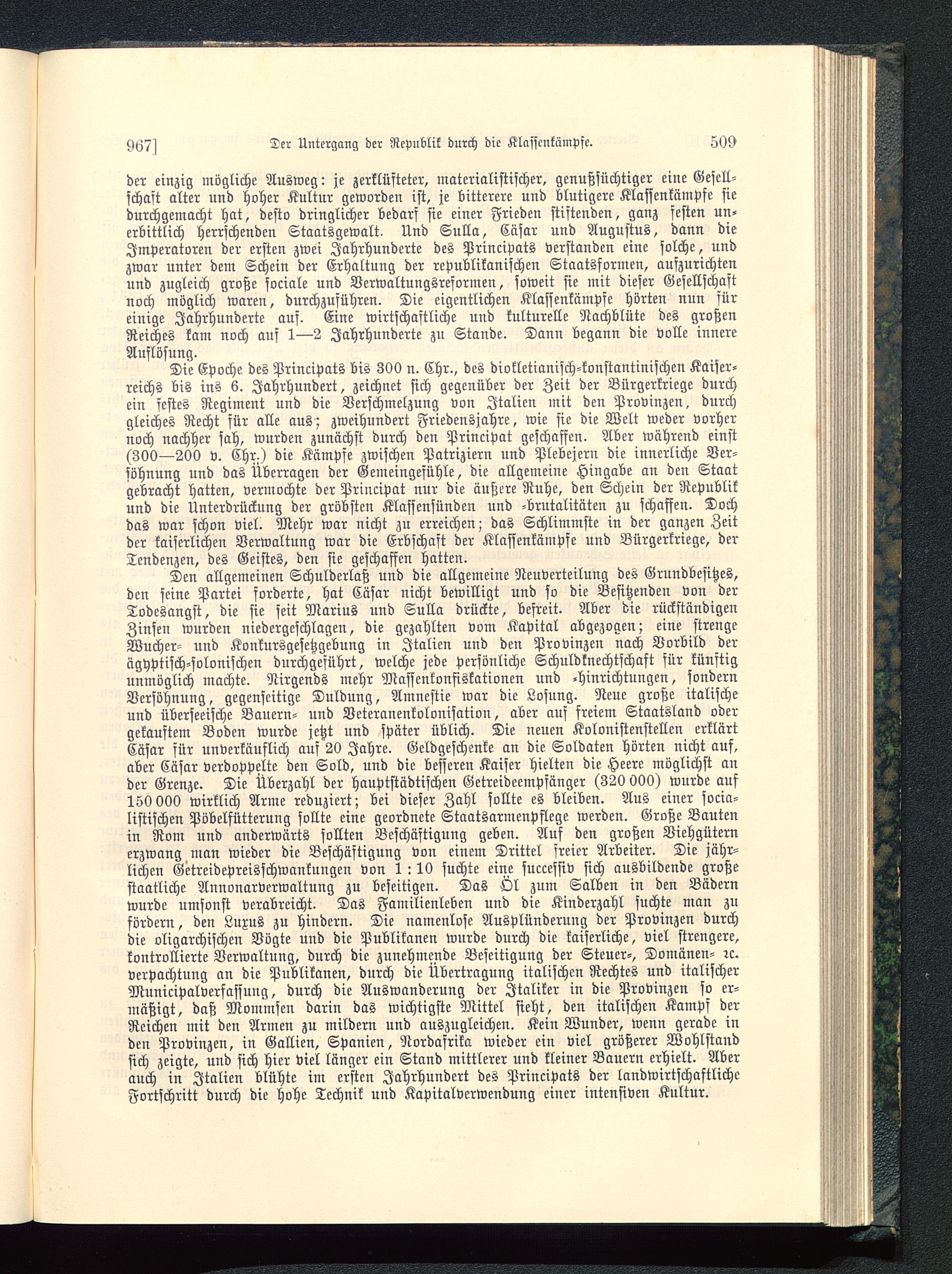 Die Epoche des Principats bis 300 n. Chr., des diokletianisch-konstantinischen Kaiser-reichs bis ins 6. Jahrhundert, zeichnet sich gegenüber der Zeit der Bürgerkriege durchein festes Regiment und die Verschmelzung von Italien mit den Provinzen, durchgleiches Recht für alle aus ; zweihundert Friedensjahre, wie sie die Welt weder vorhernoch nachher sah, wurden zunächst durch den Principat geschaffen. Aber während einst(300—200 v. Chr.) die Kämpfe zwischen Patriziern und Plebejern die innerliche Ver-söhnung und das Überragen der Gemeingefühle, die allgemeine Hingabe an den Staatgebracht hatten, vermochte der Principat nur die äußere Ruhe, den Schein der Republik und die Unterdrückung der gröbsten Klassensünden und -brutalitäten zu schaffen. Dochdas war schon viel. Mehr war nicht zu erreichen; das Schlimmste in der ganzen Zeitder kaiserlichen Verwaltung war die Erbschaft der Klassenkämpfe und Bürgerkriege, derTendenzen, des Geistes, den sie geschaffen hatten.