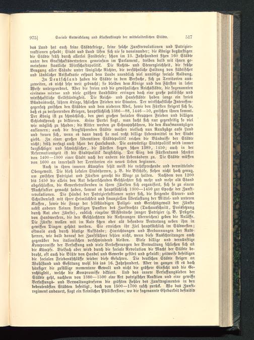 Auch in ihren inneren Kämpfen fehlt meist die rechtsprechende und vermittelndeObergewalt. Die bloß lokalen Stadtherren, z. B. die Bischöfe, stehen nicht hoch genug,um zwischen Patriziat und Zünften gerecht die Wage zu halten. Nachdem von 1200bis 1450 die allein den Rat beherrschenden Geschlechter sich mehr und mehr als Standabgeschlossen, die Gewerbetreibenden in ihren Zünften sich organisiert, sich so zu einemMachtfaktor gemacht haben, kommt es hauptsächlich 1300—1450 zur Epoche der Zunft-revolutionen. Die Händel der Patrizicrfaktionen unter sich, die steigende Steuer- undSchuldenlast mit ihrer Heimlichkeit und finanziellen Überlastung der Mittel- und unterenKlassen, sowie die Frage der selbständigen Polizei- und Gerichtsgewalt der Zünftenebst anderen kleinen streitigen Punkten des Zunstrechts (Tuchausschnitt, Preissetzungdurch Rat oder Zünfte), endlich einzelne Mißbräuchc junger Patrizier (z. B. Prügelnvon Handwerkern, die den Geschlechtern die Rechnungen überreichen) geben die Anlässe.Die Zünfte wollen mit im Rate sitzen oder als besondere Vertretung neben ihm ingewissen Dingen gehört werden. Sie erreichen ihr Ziel hauptsächlich im Südwesten;oftmals auch durch blutige Aufstände; Hinrichtungen und Verbannungen der Rats-herren, wie bald darauf der Zunftführer fehlen nicht, wenn diese Ausschreitungen auchgegenüber den italienischen verschwindend bleiben. Viele billige und vernünftigeKompromisse der Verfassung und viele Verbesserungen der Verwaltung schließen sich andie Kämpfe. Vielfach aber wird durch die sociale Revolution die Macht der Städte be-droht, oft auch die Blüte von Handel und Gewerbe gestört und geknickt; zeitweise beseitigendie socialen Friedensschlüsse wieder diese Gefahren. Die deutschen Städte steigen anWohlstand und Gesittung Wohl bis ins 16. Jahrhundert. Aber im ganzen ist es dochhäufiger die zufällige momentane Gewalt und nicht die größere Einsicht und die Ge-rechtigkeit, welche die Kompromisse diktiert. Und das innere Verfassungsleben derStädte geht, nachdem von 1380—1500 eine Art patrizischer Reaktion und eine gewisseVerfassungs- und Verwaltungsreform die größten Fehler des Zunftregimentes in denbedeutendsten Städten beseitigt, doch von 1500—1700 rasch zurück. Wo das Zunft-regiment andauert, siegt ein kleinlicher Philistersinn; wo die sogenannte Ehrbarkeit definitiv