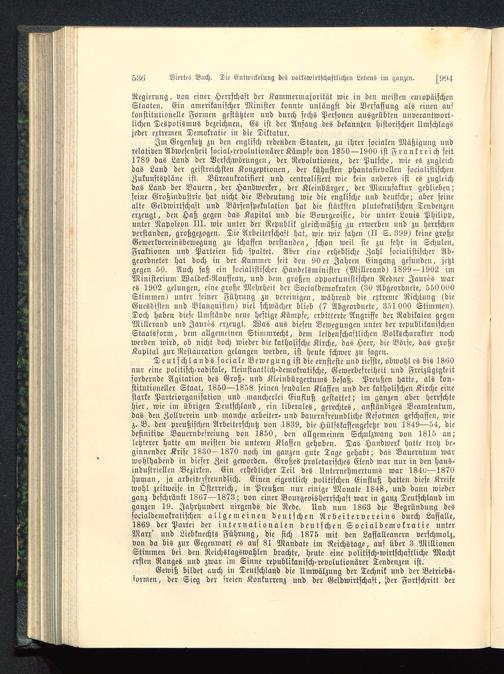 Im Gegensatz zu den englisch redenden Staaten, zu ihrer socialen Mäßigung undrelativen Abwesenheit social-revolutionärer Kämpfe von 1850—1900 ist Frankreich seit1789 das Land der Verschwörungen, der Revolutionen, der Putsche, wie es zugleichdas Land der geistreichsten Konzeptionen, der kühnsten phantasievollen socialistischenZukunftspläne ist. Büreaukratisiert und centralisiert wie kein anderes ist es zugleichdas Land der Bauern, der Handwerker, der Kleinbürger, der Manufaktur geblieben;seine Großindustrie hat nicht die Bedeutung wie die englische und deutsche; aber seinealte Geldwirtschaft und Börsenspekulation hat die stärksten plutokratischen Tendenzenerzeugt, den Haß gegen das Kapital und die Bourgeoisie, die unter Louis Philipp ,unter Napoleon III. wie unter der Republik gleichmäßig zu erwerben und zu herrschenverstanden, großgezogen. Die Arbeiterschaft hat, wie wir sahen (II S. 399) keine großeGewerkvereinsbewegung zu schaffen verstanden, schon weil sie zu sehr in Schulen,Fraktionen und Parteien sich spaltet. Aber eine erhebliche Zahl socialistischer Ab-geordneter hat doch in der Kammer seit den 90 er Jahren Eingang gefunden, jetztgegen 50. Auch saß ein socialistischer Handelsminister (Millerand) 1899 — 1902 imMinisterium Waldeck-Rousseau , und dem großen opportunistischen Redner Jaurvs wares 1902 gelungen, eine große Mehrheit der Socialdemokraten (30 Abgeordnete, 550 000Stimmen) unter seiner Führung zu vereinigen, während die extreme Richtung (dieGuesdisten und Blanquisten) viel schwächer blieb (7 Abgeordnete, 351 000 Stimmen).Doch haben diese Umstände neue heftige Kämpfe, erbitterte Angriffe der Radikalen gegenMillerand und Jaurvs erzeugt. Was aus diesen Bewegungen unter der republikanischenStaatsform, dem allgemeinen Stimmrecht, dem leidenschaftlichen Volkscharakter nochwerden wird, ob nicht doch wieder die katholische Kirche , das Heer, die Börse, das großeKapital zur Restauration gelangen werden, ist heute schwer zu sagen.