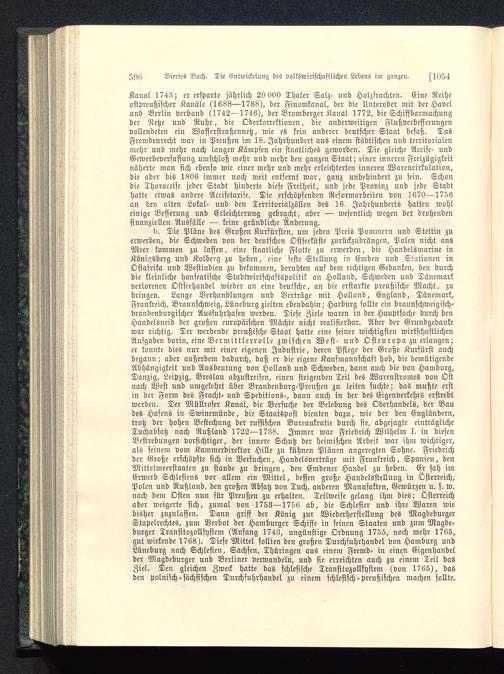 Kanal 1743; er ersparte jährlich 20 000 Thaler Salz- und Holzfrachten. Eine Reiheostpreußischer Kanäle (1688—1788), der Finowkanal, der die Unteroder mit der Havel und Berlin verband (1742—1746), der Bromberger Kanal 1772, die Schiffbarmachungder Netze und Ruhr, die Oderkorrektionen, die anderweitigen Flußverbesserungenvollendeten ein Wasserstraßennetz, wie es kein anderer deutscher Staat besaß. DasFremdenrecht war in Preußen im 18. Jahrhundert aus einem städtischen und territorialenmehr und mehr nach langen Kämpfen ein staatliches geworden. Die gleiche Accise- undGewerbeverfassung umschloß mehr und mehr den ganzen Staat; einer inneren Freizügigkeitnäherte man sich ebenso wie einer mehr und mehr erleichterten inneren Warencirkulation,die aber bis 1806 immer noch weit entfernt war, ganz unbehindert zu fein. Schondie Thoraccise jeder Stadt hinderte diese Freiheit, und jede Provinz und jede Stadthatte etwas andere Accisetarife. Die erschöpfenden Reformarbeiten von 1670—1756an den alten Lokal- und den Territorialzöllen des 16. Jahrhunderts hatten Wohleinige Besserung und Erleichterung gebracht, aber — wesentlich wegen der drohendenfinanziellen Ausfälle — keine gründliche Änderung.