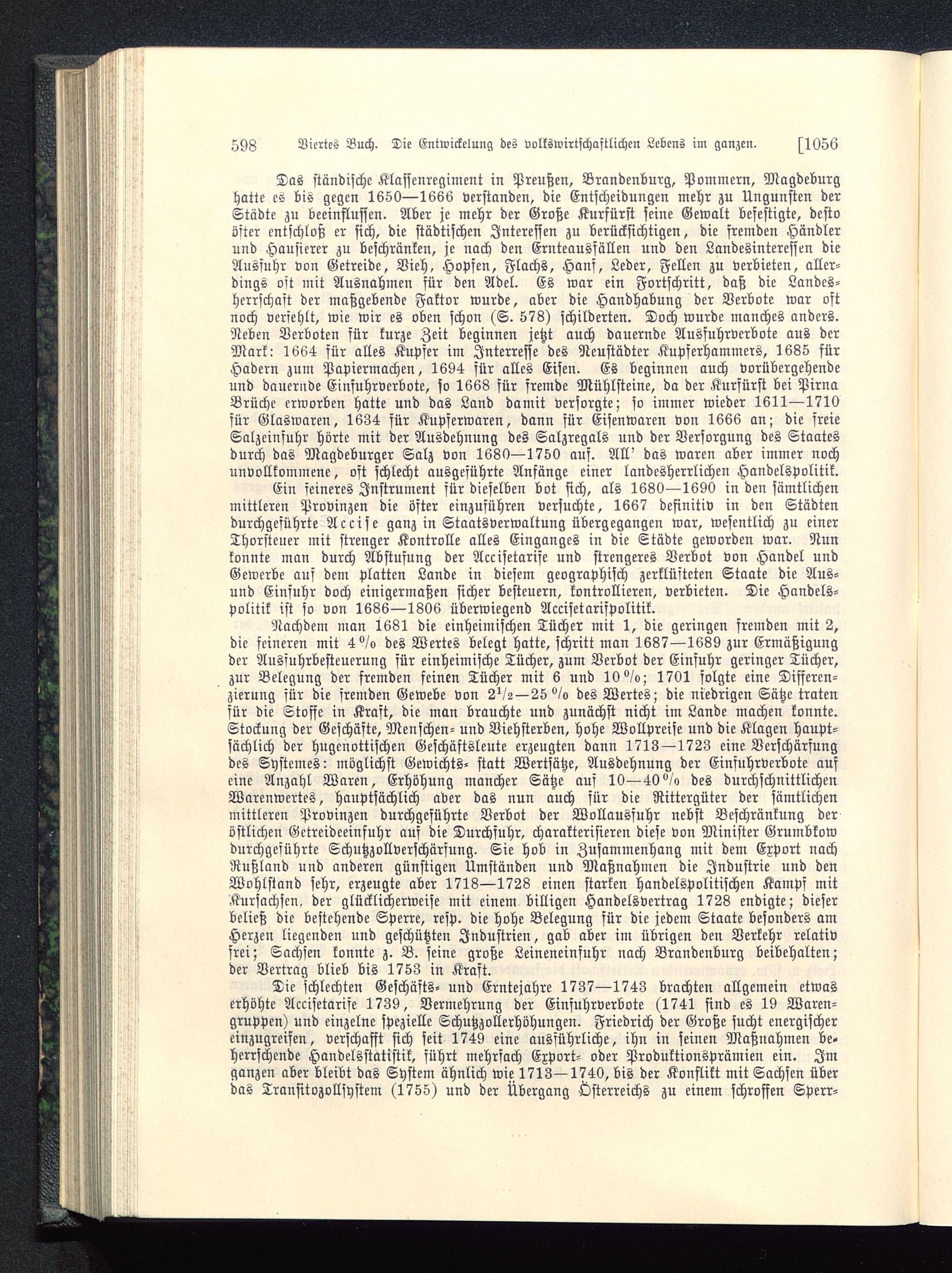 Die schlechten Geschäfts- und Erntejahre 1737—1743 brachten allgemein etwaserhöhte Accisetarise 1739, Vermehrung der Einführverbote (1741 sind es 19 Waren-gruppen) und einzelne spezielle Schutzzollerhöhungen. Friedrich der Große sucht energischereinzugreifen, verschafft sich seit 1749 eine ausführliche, ihn in seinen Maßnahmen be-herrschende Handelsstatistik, führt mehrfach Export- oder Produktionsprämien ein. Imganzen aber bleibt das System ähnlich wie 1713—1740, bis der Konflikt mit Sachsen überdas Transitozollsystem (1755) und der Übergang Österreichs zu einem schroffen Sperr-