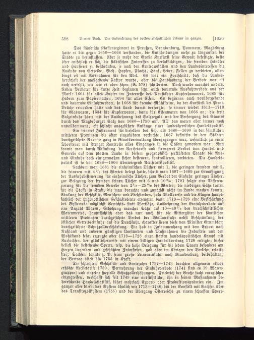 Das ständische Klassenregiment in Preußen, Brandenburg, Pommern, Magdeburg hatte es bis gegen 1650—1666 verstanden, die Entscheidungen mehr zu Ungunsten derStädte zu beeinflussen. Aber je mehr der Große Kurfürst seine Gewalt besestigte, destoöfter entschloß er sich, die städtischen Interessen zu berücksichtigen, die sremden Händlerund Hausierer zu beschränken, je nach den Ernteaussällen und den Landesinteressen dieAussuhr von Getreide, Vieh, Hopfen, Flachs, Hanf, Leder, Fellen zu verbieten, aller-dings ost mit Ausnahmen für den Adel. Es war ein Fortschritt, daß die Landes-herrschaft der maßgebende Faktor wurde, aber die Handhabung der Verbote war oftnoch verfehlt, wie wir es oben schon (S. 578) schilderten. Doch wurde manches anders.Neben Verboten sür kurze Zeit beginnen jetzt auch dauernde Ausfuhrverbote aus derMark: 1664 für alles Kupfer im Jnterresse des Neustädter Kupferhammers, 1685 fürHadern zum Papiermachen, 1694 für alles Eisen. Es beginnen auch vorübergehendeund dauernde Einfuhrverbote, so 1668 für fremde Mühlsteine, da der Kursürst bei Pirna Brüche erworben hatte und das Land damit versorgte; so immer wieder 1611—1710für Glaswaren, 1634 für Kupferwaren, dann für Eisenwaren von 1666 an; die sreieSalzeinfuhr hörte mit der Ausdehnung des Salzregals und der Versorgung des Staatesdurch das Magdeburger Salz von 1680—1750 auf. All' das waren aber immer nochunvollkommene, oft schlecht ausgeführte Anfänge einer landesherrlichen Handelspolitik.