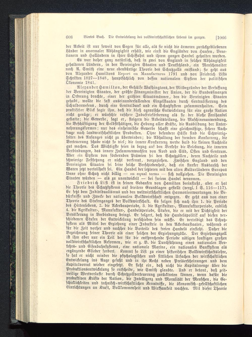 Friedrich List ist in seinen Gedanken von Hamilton beeinflußt, aber er hatdie Theorie des Schutzsystems auf breitere Grundlagen gestellt (vergl. I S. 116—117).Er setzt dem Individualismus und den weltwirtschaftlichen Harmonieerwartungen die Be-dürfnisse und Zwecke der nationalen Volkswirtschaft entgegen. Er geht aus von einerTheorie des Stufenganges der Volkswirtschaft. Es folgen sich nach ihm 1. die Periodedes Hirtenlebens, 2. die Ackerbaupcriode, 3. die Agrikultur-, Manufakturperiode, endlich4. die Agrikultur-, Manufaktur-, Handelsperiode, Stufen, die er mit der Dichtigkeit derBevölkerung in Verbindung bringt. Er folgert, daß die Handelspolitik auf diesen ver-schiedenen Stufen der Entwickelung verschieden sein müsse. Er verteidigt das Schutz-system als Mittel der Erziehung einer Industrie in den Ackerbaustaatcn, während erfür die Zeit vorher und nachher die Vorteile des freien Handels einsieht. Daher dieBezeichnung seiner Theorie als einer solchen der Erziehungszölle. Der Erziehuugszollist ihm aber nur ein Teil der für die entsprechende Periode nötigen sonstigen großenvolkswirtschaftlichen Reformen, wie er z. B. die Durchführung eines nationalen Ver-kehrs- und Eisenbahnsystems, eine nationale Marine, ein nationales Banksystem alsergänzende Glieder fordert. Kommt so List zu einer historischen Volkswirtschaftslehre,so hat er nicht minder die psychologischen und sittlichen Ursachen der wirtschaftlichenEntwickelung ins Auge gefaßt und in ihr Recht neben Preiserscheinuugen und demKapitalvorrat wieder eingesetzt. Er sieht ein, daß nicht die Kapitalmenge über dieProduktionsentwickelung so entscheide, wie Smith glaubte. Und er betont, daß zeit-weilige Wertvcrluste durch Schutzzollverteuerung zurücktreten können, wenn dafür dieproduktive» Kräfte der Nation, die Intelligenz und Moralität der Menschen, die Ge-schicklichkeiten und technisch-wirtschaftlichen Kenntnisse, die ökonomisch-gesellschaftlichenEinrichtungen an Kraft, Vollkommenheit und Wirksamkeit wachsen. Mit dieser Theorie