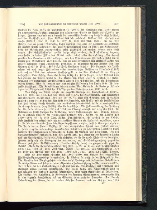 machten die Zölle 38°/o im Durchschnitt (5—200°/o im einzelnen) aus; 1387 warendie unveränderten Zollsätze gegenüber dem allgemeinen Sinken der Preise auf 47,10°/» ge-stiegen. Immer empfand man damals die europäische Konkurrenz deshalb nicht so stark,weil der Brotstoffexport, schon 1861—1864 sehr erheblich, 1871—1883 riesenhaft an-wuchs (1830 7, 1850 13, 1360 24, 1870 72, 1880 288 Mill. Doll.), In den 30erJahren trat ein gewisser Rückschlag dieser Ausfuhr ein; auch die agrarische Kolonisationim Westen wurde langsamer; das gute Regierungsland ging zu Ende; den Riesengrund-besitz der Eisenbahnen zwangsmäßig rasch zugänglich zu machen, konnte man nichtwagen. Die Geschäftsflauheit wollte lange nicht weichen, die Trustbildung begann;man suchte in hohen Zöllen das Mittel rascher industrieller Entwickelung. Der Kampfzwischen den Demokraten (für mäßigen) und den Republikanern (für hohen Zoll) wurdeimmer zum Mittelpunkt aller Politik. Die im Amt befindlichen Republikaner kauften sichweitere Stimmen durch zunehmende Pensionen an angebliche frühere Krieger und ihreWitwen (1877 28 Mill., 1897 147,5 Doll. Pensionen jährl.). Sie hinderten die Tarif-resorm des nach langer Zeit wieder ersten demokratischen Präsidenten Cleveland (1887)und wußten 1890 dem extremen Hochschutzzoll in der Mac Kinley-Bill den Sieg zuverschaffen. Sein Erfolg schien aber so ungünstig, die Preise stiegen so, der Mißmut überdas Treiben der Trusts wuchs so, die Krisis von 1893 zeigte so deutlich die Nicht-erfüllung der angeblichen lohnsteigernden Folgen des Schutzzolles, daß die Demokratenwieder siegten. Aber sie konnten nur eine mäßige Milderung des Tarifs 1394 (Wilson-tarif) durchsetzen. Die Republikaner kehrten unter Mac Kinley in die Amter zurück undsetzten im Dingleytarif 1896 die Rückkehr zu den Principien von 1390 durch.