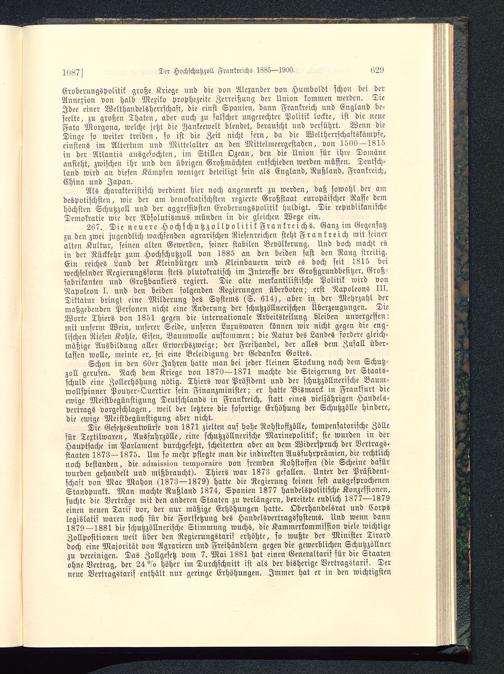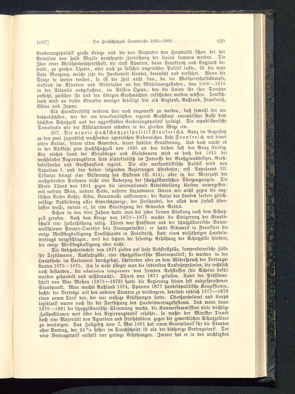 267. Die neuere Hochschutzzollpolitik Frankreichs . Ganz im Gegensatzzu den zwei jugendlich wachsenden agrarischen Riesenreichen steht Frankreich mit seineralten Kultur, seinen alten Gewerben, seiner stabilen Bevölkerung. Und doch macht esin der Rückkehr zum Hochschutzzoll von 1885 an den beiden sast den Rang streitig.Ein reiches Land der Kleinbürger und Kleinbauern wird es doch seit 1815 beiwechselnder Regierungsform stets plutokratifch im Interesse der Großgrundbesitzer, Groß-sabrikanten und Großbankiers regiert. Die alte merkantilistische Politik wird vonNapoleon I. und den beiden folgenden Regierungen überboten; erst Napoleons III.Diktatur bringt eine Milderung des Systems (S. 614), aber in der Mehrzahl dermaßgebenden Personen nicht eine Änderung der schutzzöllnerischen Überzeugungen. DieWorte Thiers von 1851 gegen die internationale Arbeitsteilung bleiben unvergessen:mit unserm Wein, unserer Seide, unseren Luxuswaren können wir nicht gegen die eng-lischen Riesen Kohle, Eisen, Baumwolle aufkommen; die Natur des Landes fordere gleich-mäßige Ausbildung aller Erwerbszweige; der Freihandel, der alles dem Zufall über-lassen wolle, meinte er, sei eine Beleidigung der Gedanken Gottes.