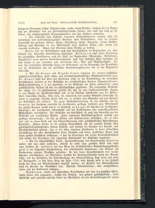 ä. Mit St. Simon und Auguste Comte beginnen die neueren halbphilo-sophisch-socialistischen, halb rechts- und wirtschaftsgeschichtlichen Geschichtskonstrukt onen.St. Simon sucht den Kern des Problems nicht in der Entwickelung der politischenVerfassungen, sondern in der Geschichte der wirtschaftlichen Formen (Eigentumsformen,Klassenentwickelung u. s. w.) einerseits, in der Geschichte der Ideen andererseits: jedesgesellschaftliche System ist auf ein philosophisches gegründet. Die europäische Geschichteder letzten 10—12 Jahrhunderte zerfällt für ihn in eine feudal-militärische Epoche,in eine Epoche der Juristcnherrschaft und in die künftige industrielle, von der Wissen-schaft beherrschte Epoche. Eine Zeit, die einheitlich von großen Gedanken beherrscht ist,nennt er organisch; kritische Zeiten sind die, in welchen neue Gedanken auf neue Formender Gesellschaft hin arbeiten. Die ganze Geschichtseinteilung ist eine ähnliche, wie dieComtes, der durchaus empirisch die herrschenden geistigen Zustände zum Mittelpunktder großen Epochen macht und so im Anschluß an Turgot die Epochen der herrschendenTheologie, der herrschenden Metaphysik und des Positivismus (der empirisch-PositivenWissenschaft) unterscheidet. Die Geschichte der Gesellschaft ist nach ihm beherrscht von derGeschichte des menschlichen Geistes. Jeder bestehende Gesellschastszustand entsteht ausgeistigen Strömungen, die sich zu Sitten und Institutionen verdichten, die in jederZeit und in jedem Volke auf eine Übereinstimmung aller gesellschaftlichen Einrichtungenhinwirken. Indem Comte so die geistige Gemeinschaft als die centrale Ursache allesgesellschaftlich-geschichtlichen Lebens hinstellt und daraus die Epochen des Staats- undWirtschaftslebens ableitet, hat er bei allen einzelnen Irrtümern in seiner historischenDarstellung, bei aller Anfechtbarkeit seiner Methode und seiner praktischen Ideale docheinen großen Fortschritt vollzogen; er hat die Sociologie als sociale Centralwissenschaftund (neben den Deutschen) eine eigentliche Philosophie der Geschichte begründet.