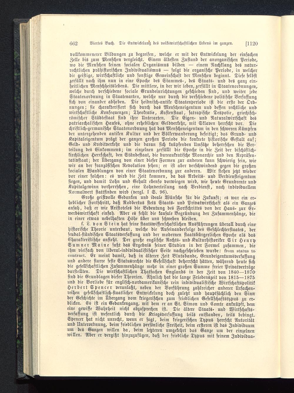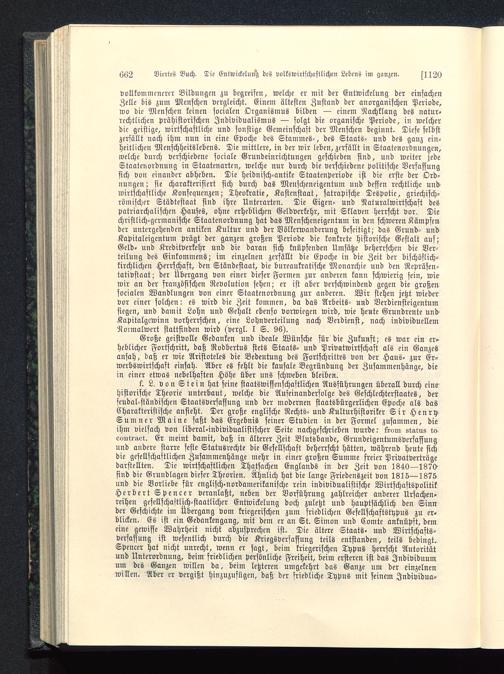 k. L, von Stein hat seine staatswissenschaftlichen Ausführungen überall durch einehistorische Theorie unterbaut, welche die Aufeinanderfolge des Geschlechterstaates, derfeudal-ständifchen Staatsverfassung und der modernen staatsbürgerlichen Epoche als dasCharakteristische ansieht. Der große englische Rechts-und Kulturhistoriker Sir HenrySumner Maine saßt das Ergebnis seiner Studien in der Formel zusammen, dieihm vielfach von liberal-individualistischer Seite nachgeschrieben wurde: trora staws to.eoutraet. Er meint damit, daß in älterer Zeit Blutsbande, Grundeigentumsverfassungund andere starre feste Statusrechte die Gesellschaft beherrscht hätten, während heute sichdie gesellschaftlichen Zusammenhänge mehr in einer großen Summe freier Privatverträgedarstellten. Die wirtschaftlichen Thatsachen Englands in der Zeit von 1840—1870sind die Grundlagen dieser Theorien. Ähnlich hat die lange Friedenszeit von 1815—1875und die Vorliebe für englisch -nordamerikanische rein individualistische WirtschaftspolitikHerbert Spencer veranlaßt, neben der Vorführung zahlreicher anderer Ursachen-reihen gesellschaftlich-staatlicher Entwickelung doch zuletzt und hauptsächlich den Sinnder Geschichte im Übergang vom kriegerischen zum friedlichen Gefellschaftstypus zu er-blicken. Es ist ein Gedankengang, mit dem er an St. Simon und Comte anknüpft, demeine gewisse Wahrheit nicht abzusprechen ist. Die ältere Staats- und Wirtschafts-verfassung ist wesentlich durch die Kriegsverfassung teils entstanden, teils bedingt.Spencer hat nicht unrecht, wenn er sagt, beim kriegerischen Typus herrscht Autoritätund Unterordnung, beim friedlichen Persönliche Freiheit, beim ersteren ist das Individuumum des Ganzen willen da, beim letzteren umgekehrt das Ganze um der einzelnenwillen. Aber er vergißt hinzuzufügen, daß der friedliche Typus mit seinem Jndividua-
