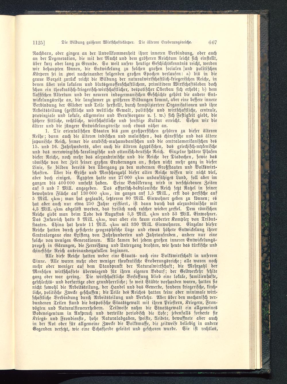 Nachbarn, oder gingen an der UnVollkommenheit ihrer inneren Verbindung, oder auchan der Degeneration, die mit der Macht und dem größeren Reichtum leicht sich einstellt,über kurz oder lang zu Grunde. So weit unsere heutige Geschichtskenntnis reicht, werdenwir behaupten können, die Entwickelung zu solchen großen socialen sund politischenKörpern sei in zwei nacheinander salzenden großen Epochen verlausen: a) bis in diegraue Vorzeit zurück reicht die Bildung der naturalwirtschaftlich-kriegerischen Reiche, indenen über rein lokalem und blutsgenofsenschaftlichem, primitivem Wirtschaftsleben dochschon ein theokratisch-kriegerisch-wirtschaftlicher, despotischer Oberbau sich erhebt; b) demklassischen Altertum und der neueren indogermanischen Geschichte gehört die andere Ent-wickelungsreihe an, die langsamer zu größeren Bildungen kommt, aber eine bessere innereVerbindung der Glieder und Teile herstellt, durch kompliziertere Organisationen und ihreArbeitsteilung (geistliche und weltliche Gewalt, politische und wirtschaftliche, centrale,provinziale und lokale, allgemeine und Berufsorgane u. s. w.) sich Festigkeit giebt, diehöhere sittliche, rechtliche, wirtschaftliche und sonstige Kultur erreicht. Sehen wir dieältere und die jüngere Entwickelungsreihe noch etwas näher an.