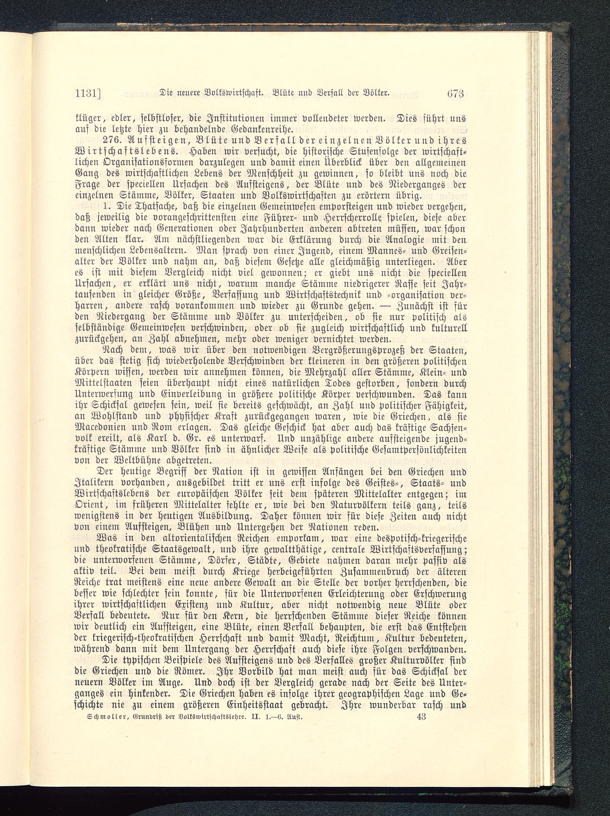 Der heutige Begriff der Nation ist in gewissen Anfängen bei den Griechen undJtalikern vorhanden, ausgebildet tritt er uns erst infolge des Geistes-, Staats- undWirtschaftslebens der europäischen Völker seit dem späteren Mittelalter entgegen; imOrient, im früheren Mittelalter fehlte er, wie bei den Naturvölkern teils ganz, teilswenigstens in der heutigen Ausbildung. Daher können wir für diese Zeiten auch nichtvon einem Aufsteigen, Blühen und Untergehen der Nationen reden.