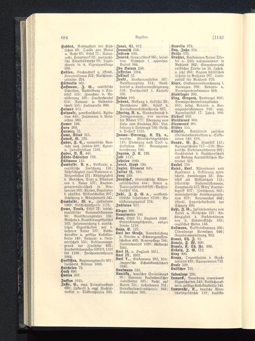 Knies, Karl , Altruismus undEgoismus z. Erklärung wirt-schaft!. Handlungen 33; Sta-tistik als Wissenschaft 115;historische Nationalökonomie,Hauptwerken?; Marx'Kapital-begriff 637; Zinstheorie 663;mittelalterliche Kreditorganisa-tion 678; Notenverbot 682;öffentl. Hvpothekarkredit derSchweiz 699.