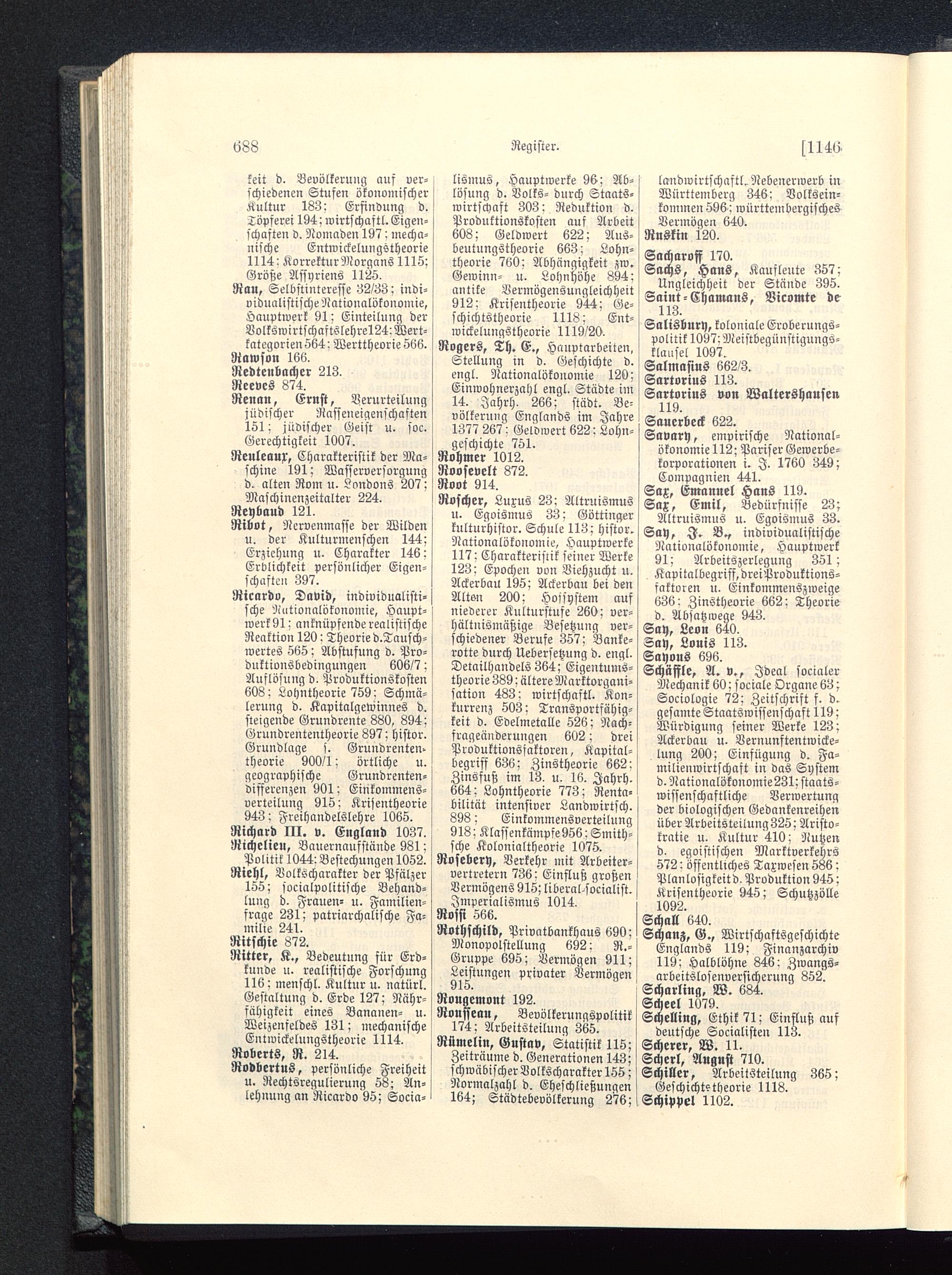 Röscher, Luxus 23: Altruismusu. Egoismus 33; Göttingerkulturhistor. Schule 113; histor.Nationalökonomie, Hauptwerke117: Charakteristik seiner Werke123; Epochen von Viehzucht u.Ackerbau 195; Ackerbau bei denAltsn 200; Hojsystem aufniederer Kulturstufe 260; ver-hältnismäßige Besetzung ver-schiedener Berufs 357; Banke-rotte durch Uebersetzung d. eugl.Detailhandels 364; Eigentums-theorie 389; ältere Marktorgani-sation 483: wirtschaftl. Kon-kurrenz 503: Transportfähig-keit d. Edelmetalle 526: Nach-frageänderungen 602; dreiProduktionsfaktoren, Kapital-begriff 636; Zinstheorie 662:Zinsfuß im 13. u. 16. Jahrh.664; Lohntheorie 773; Renta-bilität intensiver Landwirtsch.893; Einkommensverteilung918:Klassenkämpfe956:Smith-sche Kolonialtheorie 1075.